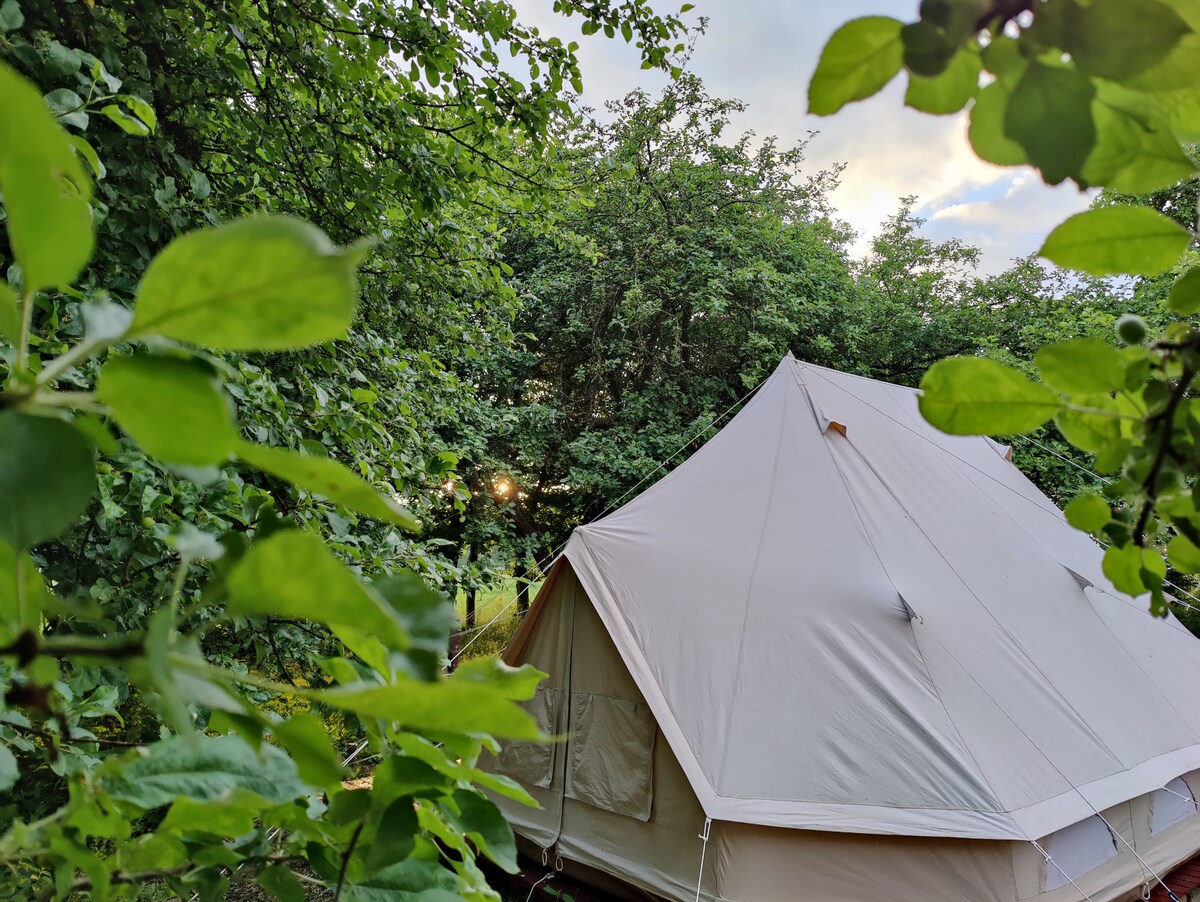 Jardim de cervejaria de pedra - glamping (acampamento no jardim) No coração de Bornholm, num jardim grande e isolado com um olhar ao pôr do sol sobre os campos até Almindingen - onde Nydamsåen atravessa o jardim, que é paisagístico em estilo cottag, há três tendas (5 metros de diâmetro) que são decoradas aconchegantes e feitas com uma cama de casal ou duas de solteiro. Há acesso à sanita e ao chuveiro partilhados, bem como à cozinha bem equipada com fogão a gás, forno, máquina de lavar louça e prateleira na geladeira/gaveta do congelador.