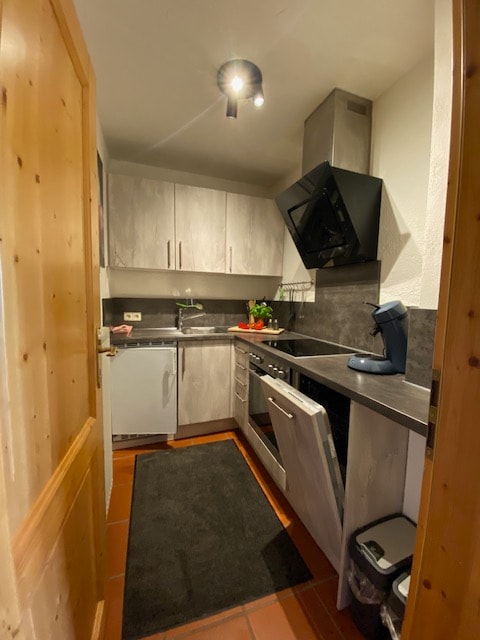 Enjoy your stay in this centrally located, modern, newly built 1-room apartment in Aalen. The new kitchen is fully equipped incl. washer-dryer, coffee and tea. The cozy 140x200cm bed accommodates up to 2 people, luggage can be stored in the tall cupboard or under the bed. The dining table can easily also be used as a home office thanks to 300 MBit/s WiFi 6. The modern bathroom with floor-level shower and underfloor heating as well as the underground parking space round off the apartment.