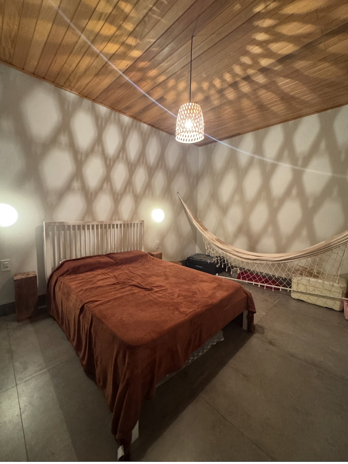 A Cabana da Miranda é um refúgio de silêncio e pausa em meio à natureza, ideal para até dois casais que buscam descanso e reconexão. Localizada em condomínio rural fechado próximo a Olhos D’Água GO, oferece ambiente rústico e acolhedor, com cama super king e cama de casal com colchão Simmons Denver, ar-condicionado, Wi-Fi e cozinha equipada. Área externa com mini piscina, ducha, churrasqueira e fogueira. Recomenda-se uso de tênis e repelente por estar em área de mata, perfeita para desacelerar.