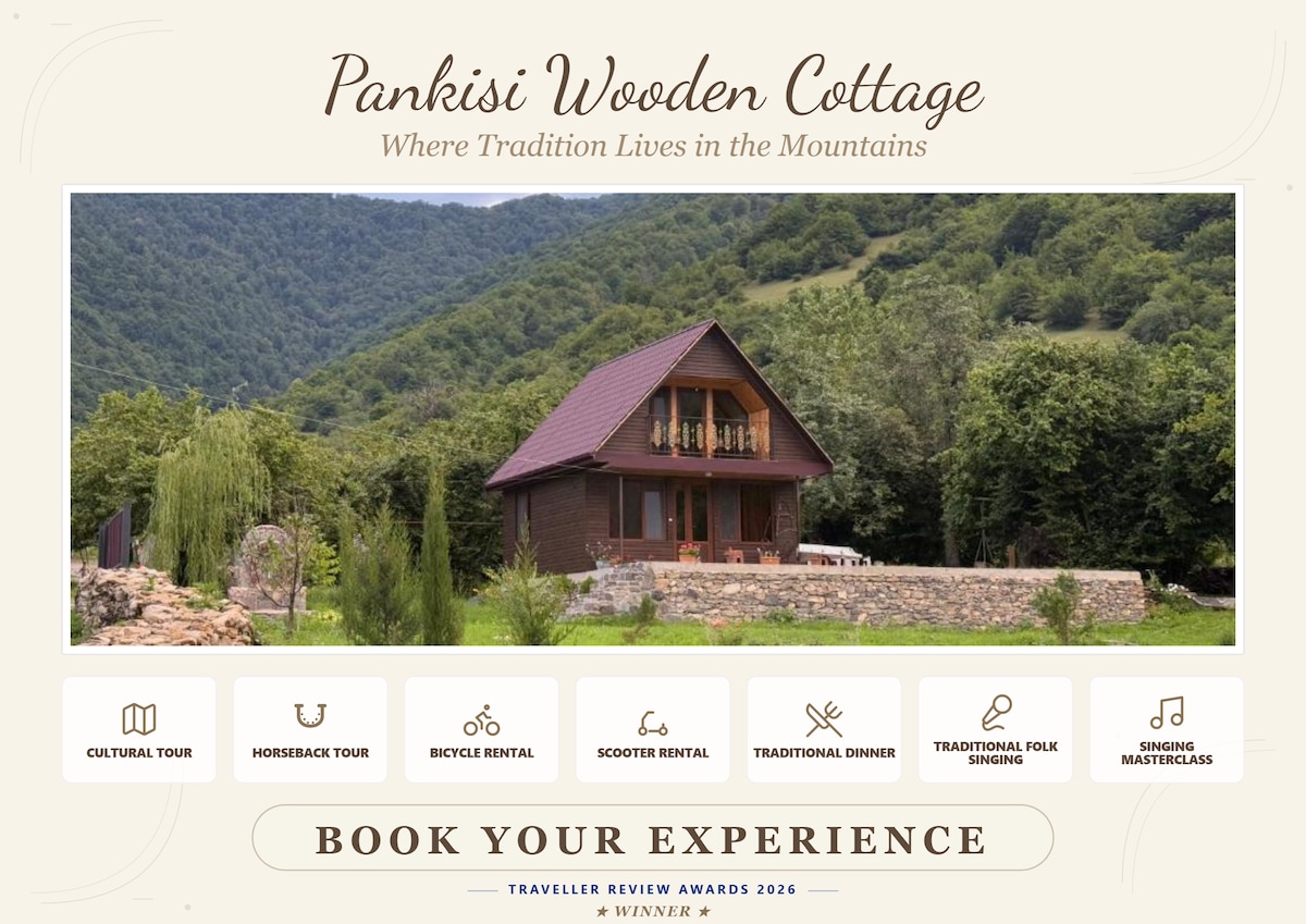 Bem-vindo ao Pankisi Wooden Cottage! A sua escapadela perfeita na natureza no coração de Pankisi Gorge. Aqui, irá encontrar: Um ambiente tranquilo e confortável com vistas deslumbrantes; A casa de campo está totalmente equipada com todos os essenciais para a vida e eletrodomésticos; Ideal para famílias, amigos ou pequenos grupos; Descubra a rica cultura local da comunidade Kist e da vida da aldeia! Passe algum tempo na natureza e desfrute do ambiente agradável!