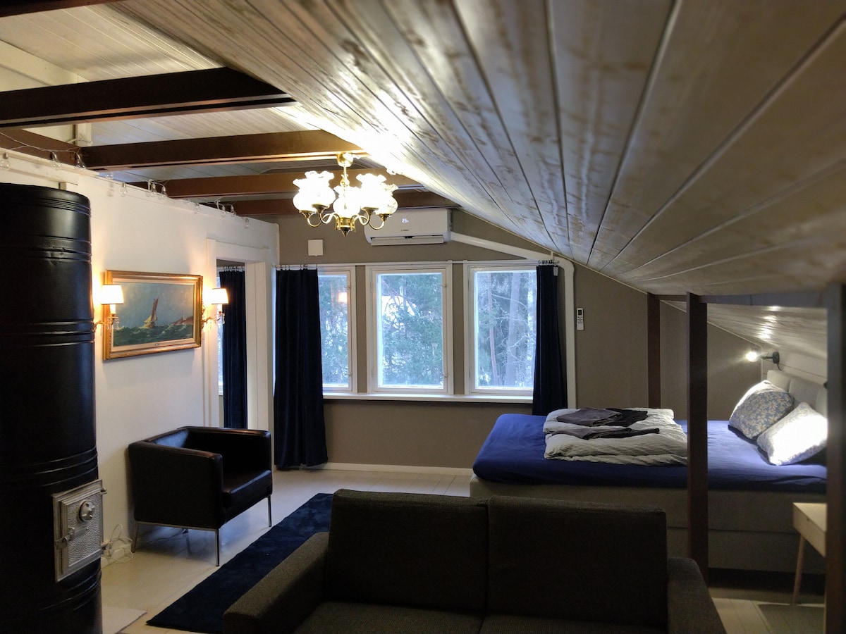 A propriedade está localizada no centro de Rymättylä, com o seu próprio jardim amplo e tranquilo. Loft moído, sala de lareira, cozinha, sauna, sanita e grande terraço traseiro com churrasqueira e banheiras de hidromassagem ao ar livre. A propriedade está muito bem equipada. A casa é ótima para famílias que visitam Moominworld, casais de casamentos, aqueles que procuram o seu próprio tempo de luxo, trabalho remoto ou até ciclistas que visitam a Little Ring Road. Pode acomodar 4+3 pessoas.
