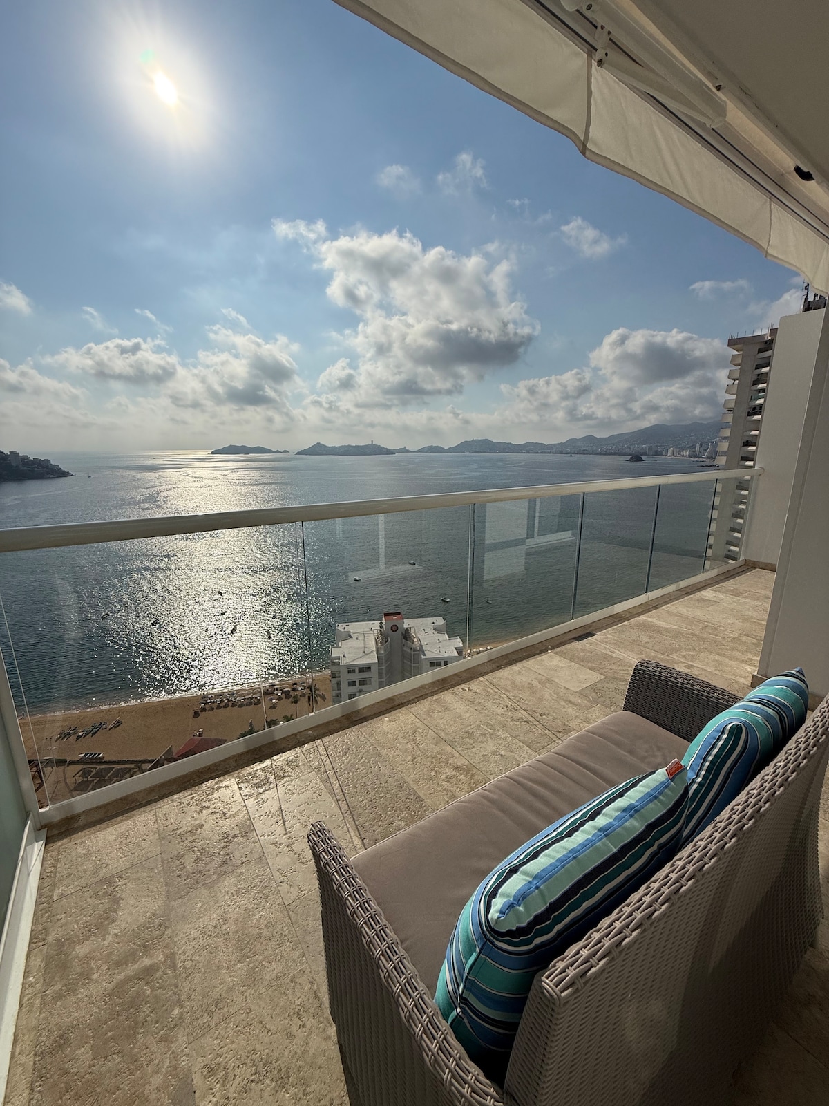 Magnífica vista panorâmica da Baía de Acapulco, localizada no 25º andar das Torres Gémeas Acapulco, com acesso à praia privada, área da piscina, vigilância 24 horas. Espaço confortavelmente mobilado para 4 pessoas, kitchenette integral, mobiliário interior e exterior, TV plana de última geração, frigorífico, forno de micro-ondas, torradeira de pão, máquina de café cápsula, secador de cabelo, ferro de engomar, toalhas de piscina e casa de banho incluídos.
