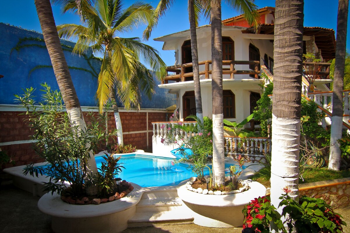 Eco-Boutique hotel Este único, de baixo impacto, eco-friendly, alojamento rústico está localizado diretamente em uma praia estendida e solitário perto de Acapulco.Os hóspedes do Hotelgilda são amigos.O hotel é uma casa de estilo colonial espanhol cercado por um jardim tropical e tem uma pequena piscina.Há sete quartos todos os quais têm um terraço e redes que é ideal para famílias. Um pequeno restaurante serve uma excelente cozinha mexicana e internacional. Animais de estimação e crianças são bem-vindos.