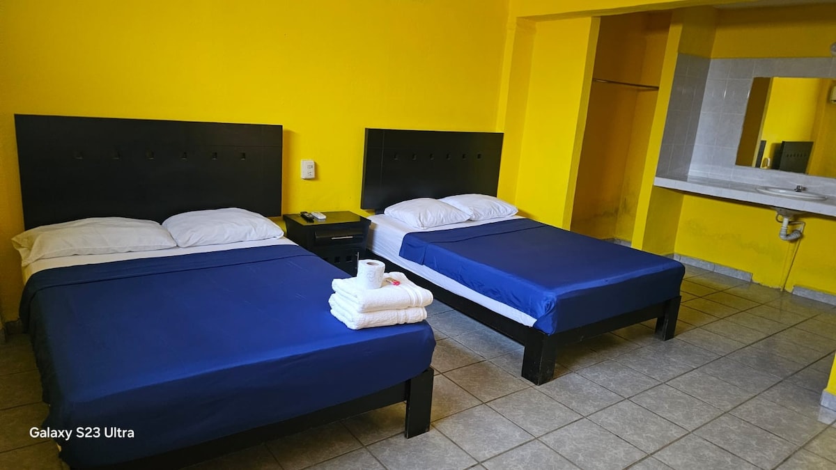 ¡Bienvenidos a Villa Arena! Esta habitación familiar ofrece comodidad y tranquilidad con dos camas matrimoniales, aire acondicionado e internet. Acceso a alberca y chapoteadero. Relájate en la terraza privada con hamaca. El baño privado con agua caliente. Disfruta de la alberca y el restaurante. ¡Somos pet friendly! Sumérgete en la belleza natural de la Barra de Coyuca con playas de arena dorada, aguas cristalinas y actividades acuáticas. ¡Reserva ahora y vive una experiencia única!