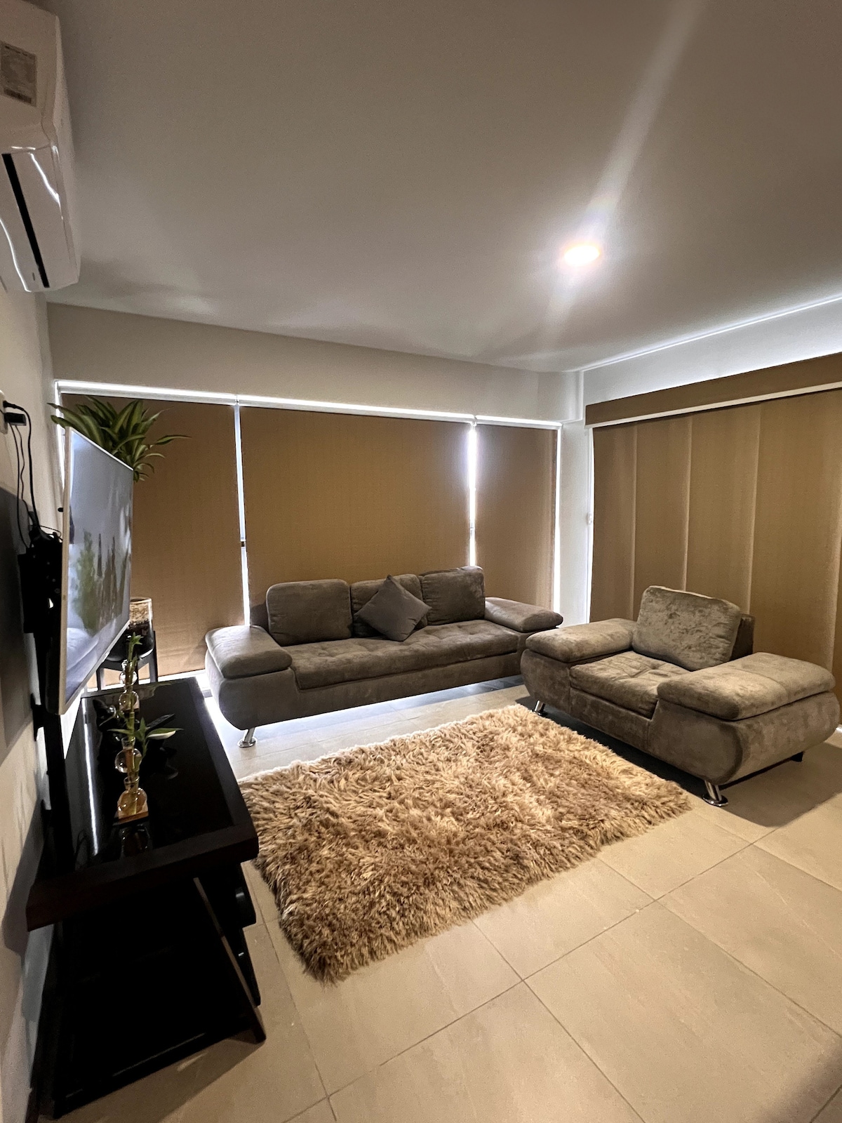 Aconchegante, limpo, central e com vistas espetaculares da cidade. Ar condicionado na sala de estar e no quarto principal. Piscina de entretenimento (o seu funcionamento está sujeito a limpeza ou reparação sem aviso prévio, por favor verifique a disponibilidade) ginásio e área para crianças. Receção. Segurança e estacionamento. Perto do Paseo Alcalde e do metro de superfície. Ficamos à espera de lhe dar as boas-vindas e de partilhar este espaço preparado para o descanso dos hóspedes.