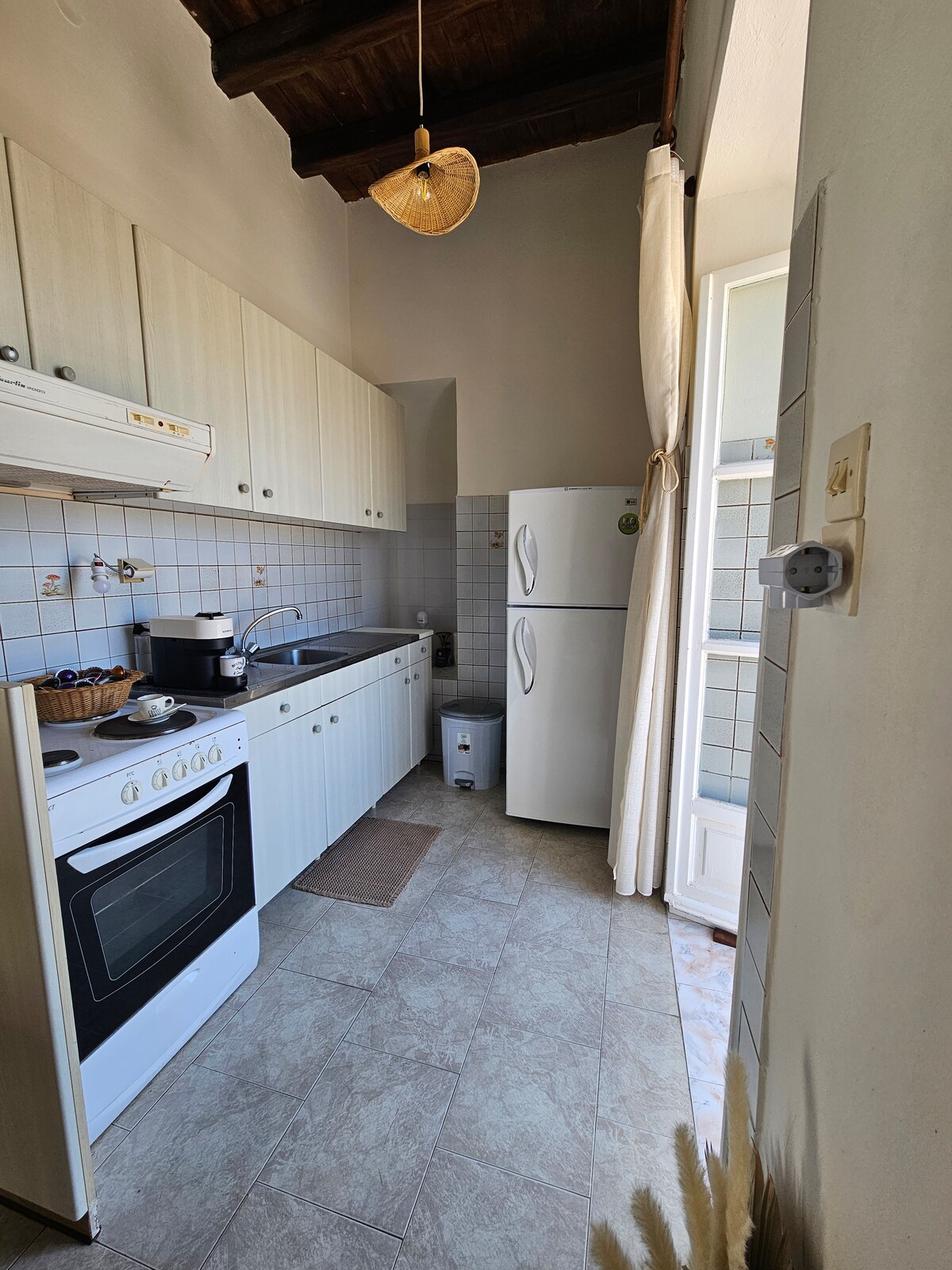 This fully renovated one bedroom apartment is on a ground floor and boasts a large shaded outdoor patio area with a peek-a-boo sea view. It is nestled among other traditional white small buildings providing a traditional local Greek Island flare. There is a living room space with kitchen annex, slick modern bathroom and a separate bedroom with double bed. Living room sofa pulls-out to a comfortable double bed. Decor is simple and minimal with a pinch of nature and monochromatic relaxing colors