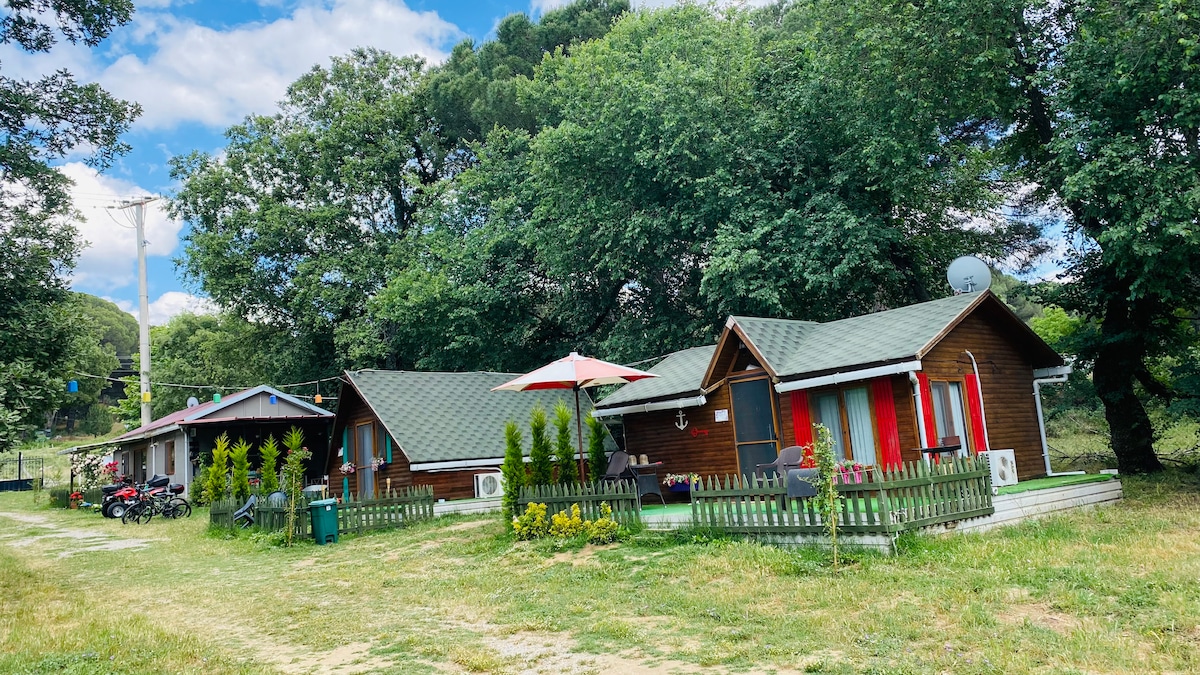 Esqueça as suas preocupações neste espaço espaçoso e sereno. Esqueça todas as três casas genéticas conhecidas, um bungalow equipado com pinheiros russos que trouxemos em privado da Rússia, quando chegar ao nosso resort, desejamos-lhe umas férias tranquilas com todo o seu espaço e 1 minuto a pé do mar:)