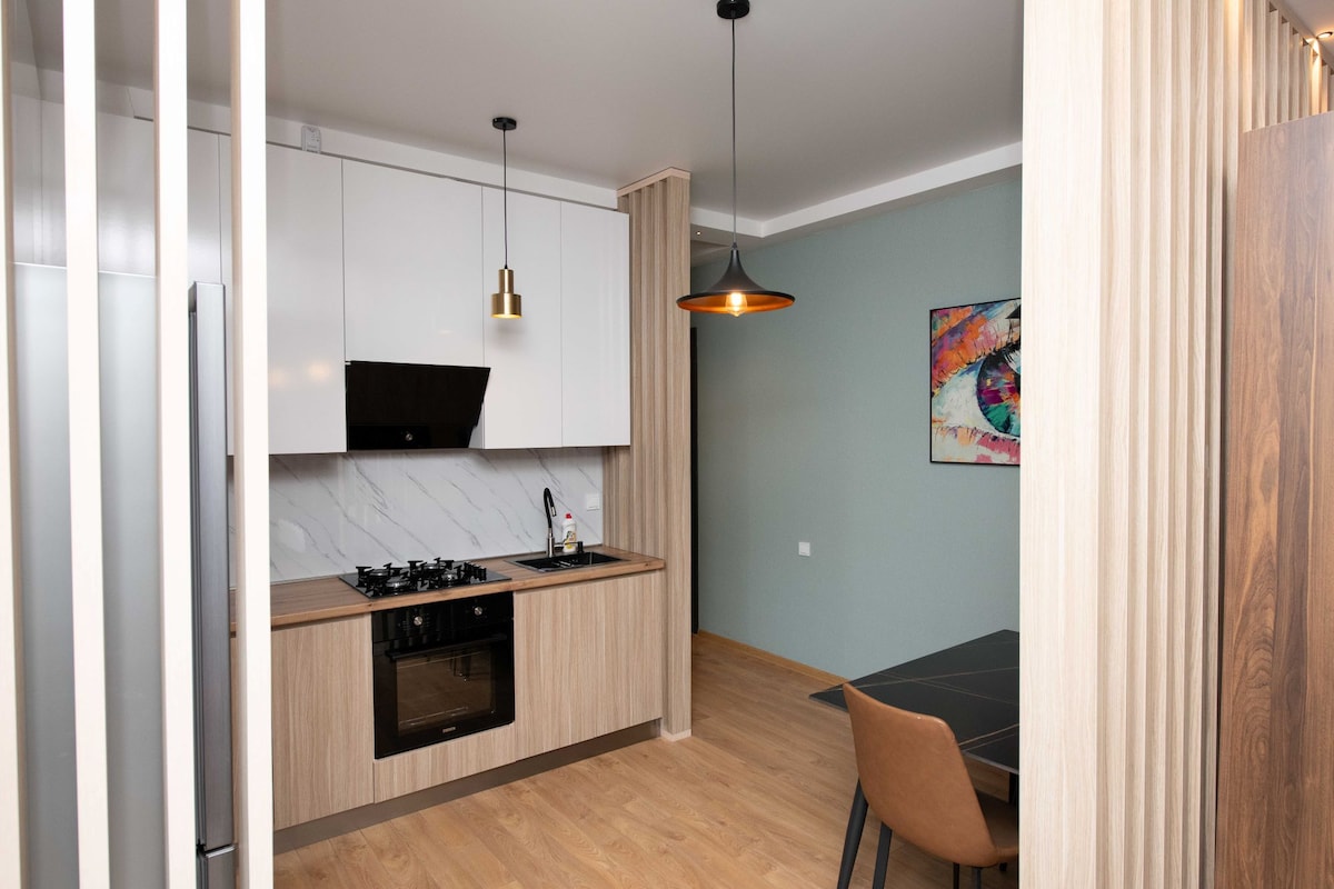 Caros amigos, estamos muito felizes em apresentar o nosso deslumbrante apartamento de 48 m² com um quarto em Gori, Geórgia - colocamos coração e alma em projetá-lo e torná-lo um lar longe de casa para os nossos hóspedes! O apartamento está localizado no centro de Gori, no 8º andar de um novo e muito procurado empreendimento do Palácio de Gori e tem uma vista encantadora da cidade e das colinas a partir da sua varanda!