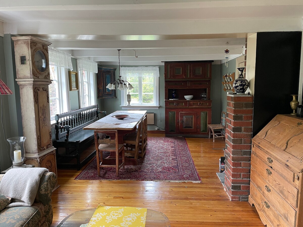 Um lugar tranquilo rodeado por uma bela natureza: floresta, mar e lago e montanhas com vista. Uma quinta mais antiga com 6 camas, bem como uma casa de barcos com 4 camas, são alugadas em conjunto. Cais privado em Lyngørsundet com 2 lugares de barco. Trampolim, celeiro com muitos brinquedos para as crianças, galinhas. Faça uma viagem romântica a remo ou de canoa no lago, alugue um barco a motor e viaje em viagem de descoberta pelo mar. Ótimas oportunidades de pesca no mar ou no lago privado. Belo terreno para caminhadas. Explorar a si mesmo e à natureza 💚
