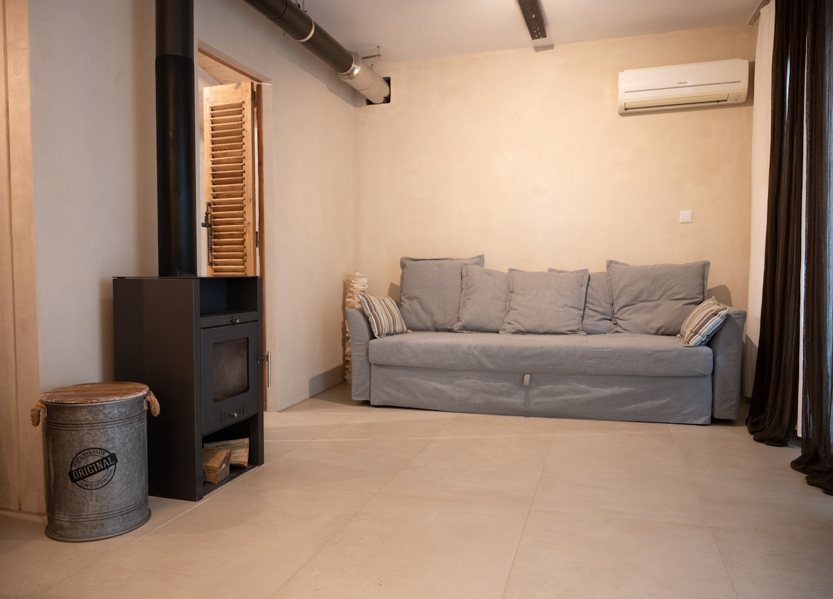 Experimente a elegância intemporal na Suite Afrodite. A nossa suíte meticulosamente concebida oferece a mistura perfeita de luxo moderno com toques de charme antigo. Adaptada de forma única com iluminação interior quente e o brilho de uma lareira, a nossa suíte cria um ambiente suave e extravagante. A propriedade está equipada com sistemas de vanguarda e cama macia para o máximo conforto. Aproveite as suas noites, relaxe junto à lareira e mergulhe na cultura e hospitalidade locais.