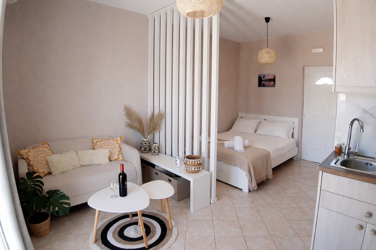 Wake up to endless blue views in this bright, quiet apartment in Anissaras, just a few steps from the beach. Enjoy your morning coffee or evening drink on the private balcony overlooking the sea. Fully equipped kitchen, comfortable space for up to 4 guests, and free parking. Ideal for a relaxing holiday, remote work, or longer stays — in a peaceful area 4 km from Hersonissos, away from the crowds but close to everything you need.