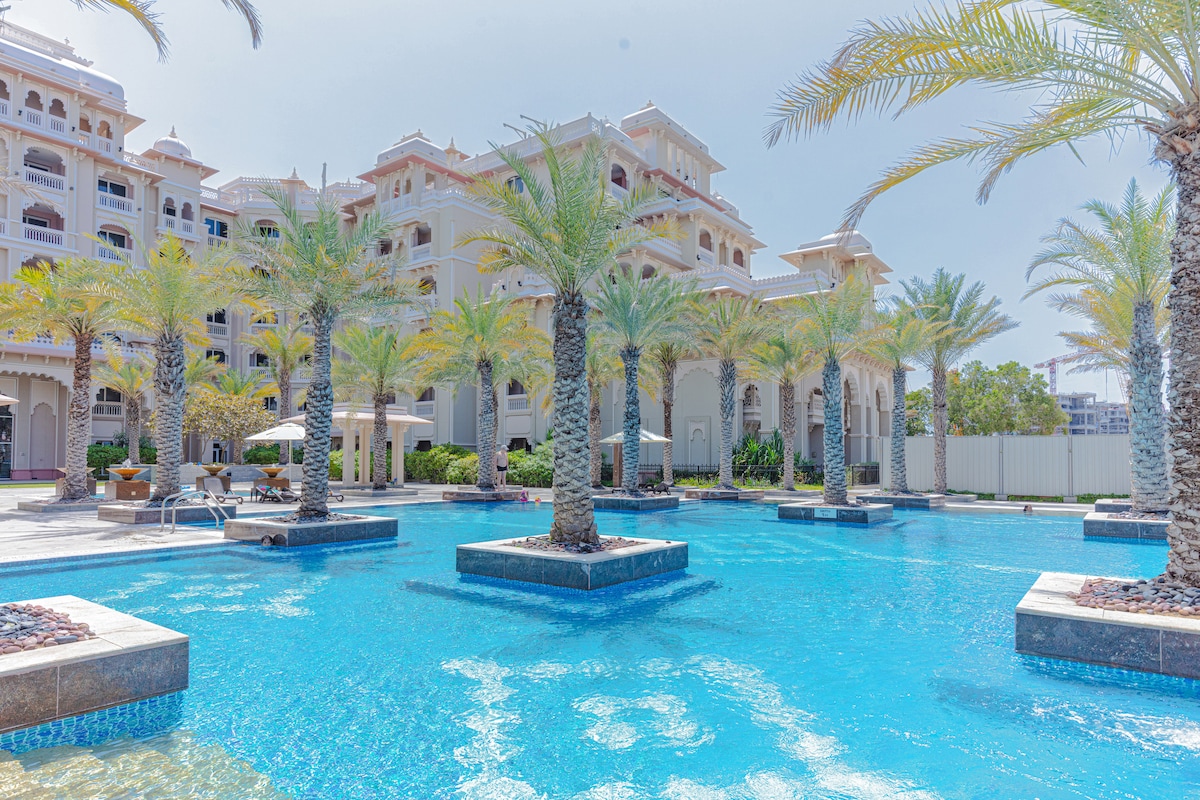 This beautiful fully-equipped 2.5-bedroom apartment is located on The Palm Jumeirah, Dubai's popular landmark, has the BEST VIEW in the building. It is perfect for family vacations. Available to you are our private BEACH and POOL and fully equipped apartment with kitchen. You can enjoy the view from 2 balconies.