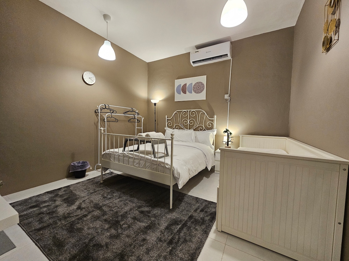 Relaxe com a sua família ou amigos neste lugar tranquilo. Está situado em Sharjah, nos Emirados Árabes Unidos. As mercearias abertas 24 horas por dia, 7 dias por semana, estão a poucos passos de distância. O Mercado Central fica a 10 minutos a pé. Estão disponíveis vários lugares de estacionamento 24 horas por dia, 7 dias por semana, para os hóspedes. Jardim exterior onde pode relaxar ao ar livre. Temos ar condicionado individual em todos os quartos e Internet de alta velocidade para trabalho remoto. Atenção: só permitimos que viajantes ou famílias fiquem aqui, por favor não reserve este espaço para encontros ou namoro.