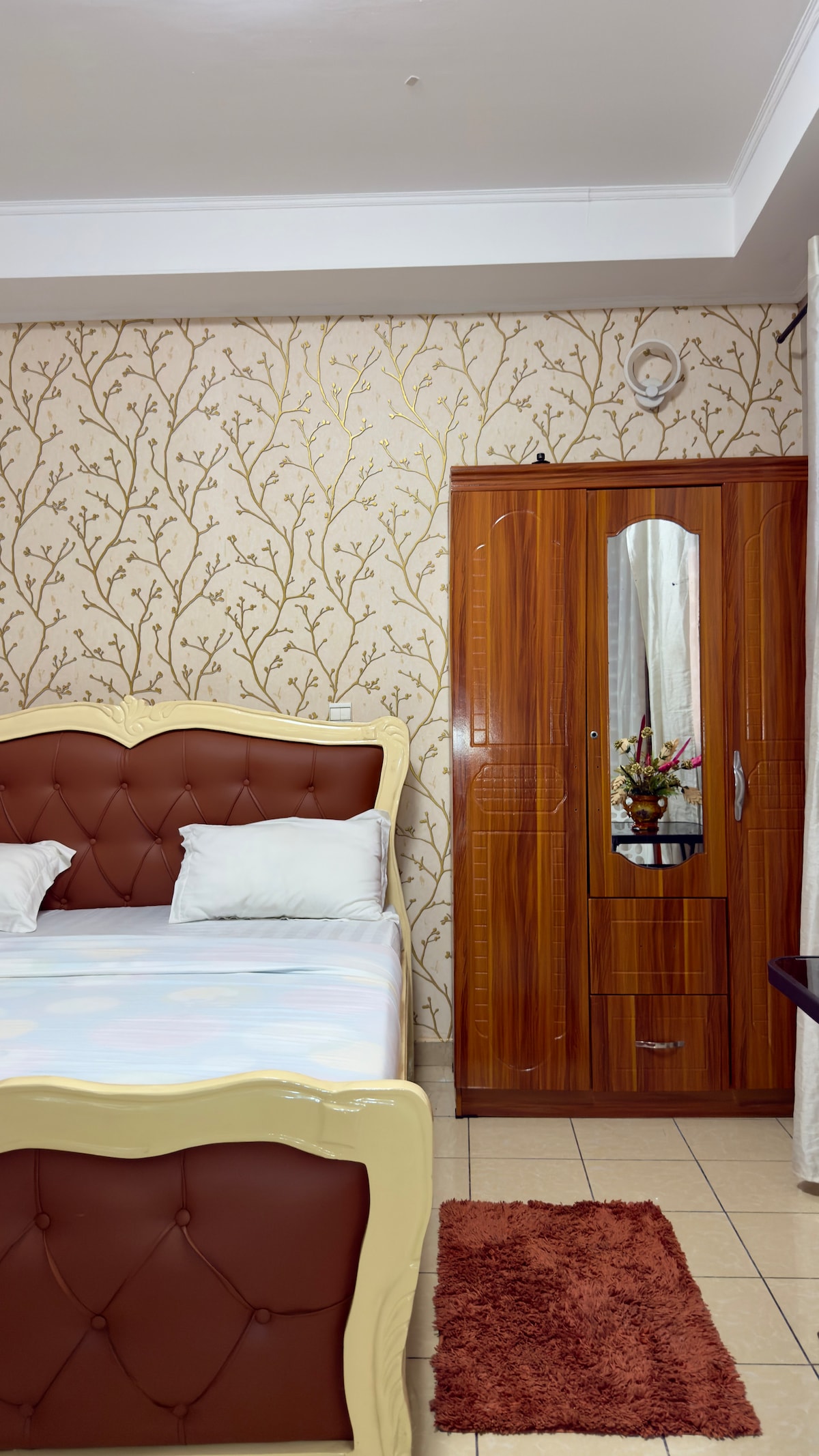 Appartement moderne de 100 m2, avec 2 chambres spacieuses équipées de lits double et dressing, un salon et salle à manger lumineuses décorés avec passion et une touche raffinée sans excès , une grande salle de bain, WC et une cuisine équipée d’électroménagers dernière génération. L appartement dispose d ‘un groupe électrogène en option locative, très utile lors des coupures d’électricité à Libreville. Nous avons hâte de vous accueillir.