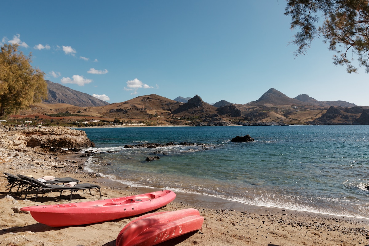 A casa deste antigo artista está escondida entre oliveiras e oferece uma vista única para o mar Arquitetura cretense típica, não luxo, mas um lugar com alma - Simples e Único :) 76m2 áreas de estar e dormir, cozinha pequena, casa de banho moderna e grande terraço. Chuveiro exterior com vista para o mar, grande jardim de oliveiras. Wi-Fi, máquina de lavar roupa, energia solar Sem TV, sem ar condicionado ! (ventilador) É recomendável um carro! Supermercado/Tavernas: a 3 min., Praia e Plakias: 6-8 min (carro)