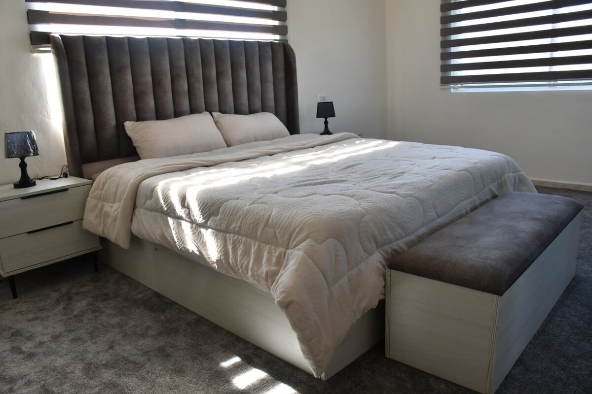 Bring the whole family to this great place with lots of room for fun. Centrally located In Irbid AL Hay Al Sharqi. Fully furnited modern private apartment. Fully equipped with WiFi internet, and appliances, A/C, heater, hot water, washer, stove and fridge. On the 3rd floor with elevator with open view of the city. Accommodate a large family 3 bedrooms with 1 queen 1 double and 2 single beds. Short or long term rentals available