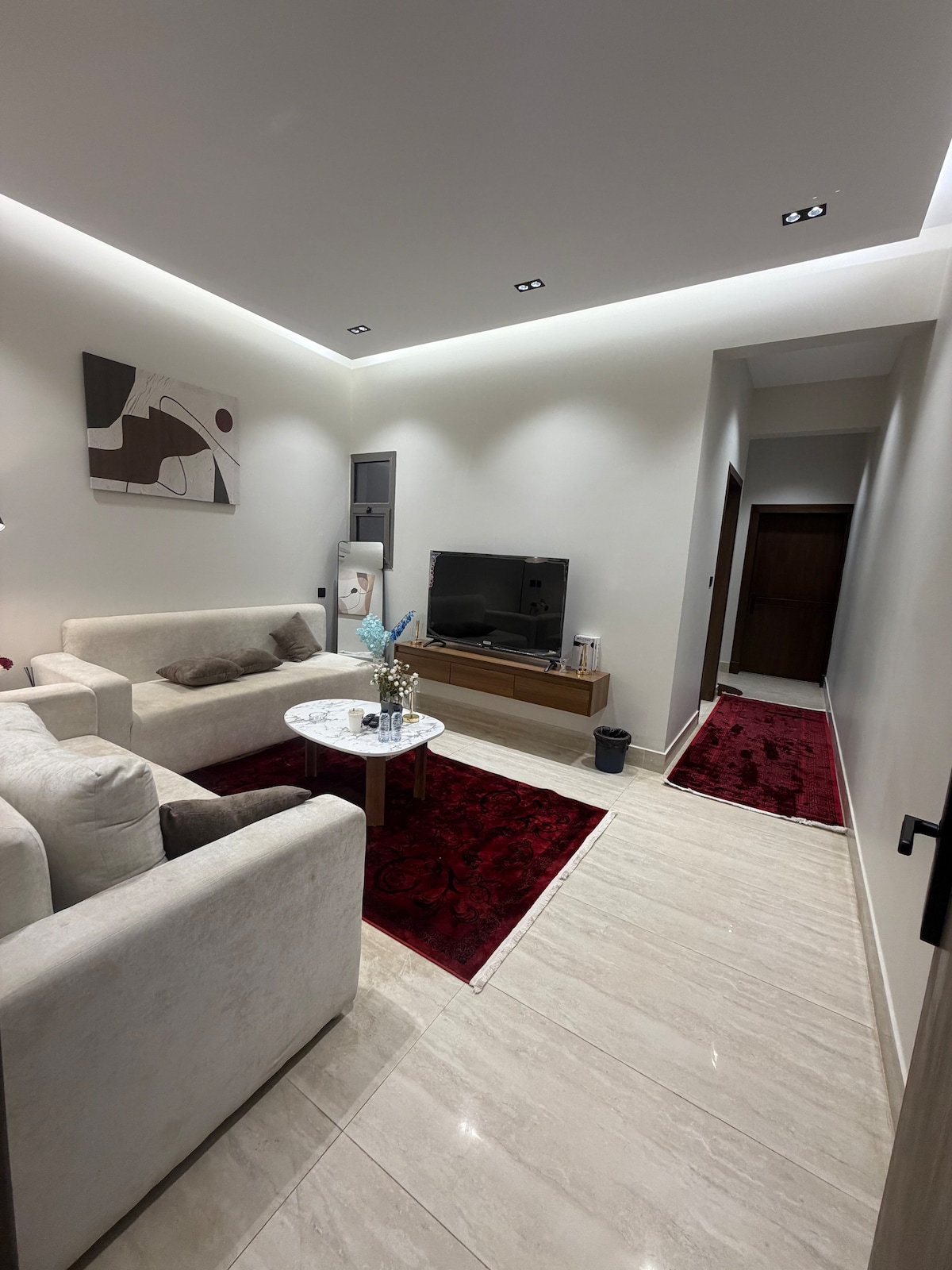 Relaxe neste espaço único e tranquilo. Apartamento de design moderno Contém um quarto com uma cama principal com um colchão de hotel e um espaço espaçoso com uma televisão inteligente de 80 polegadas com o apoio de uma subscrição Netflix Equipado com um frigorífico, um bar de café e um chá Chaleira e ferramentas para chá e uma casa de banho totalmente equipada com auto-indução e uma entrada de carro privada com hosh com uma sessão ao ar livre Localização Distinta Perto de Todos os Serviços Faculdade de Tecnologia, Base e Instituto