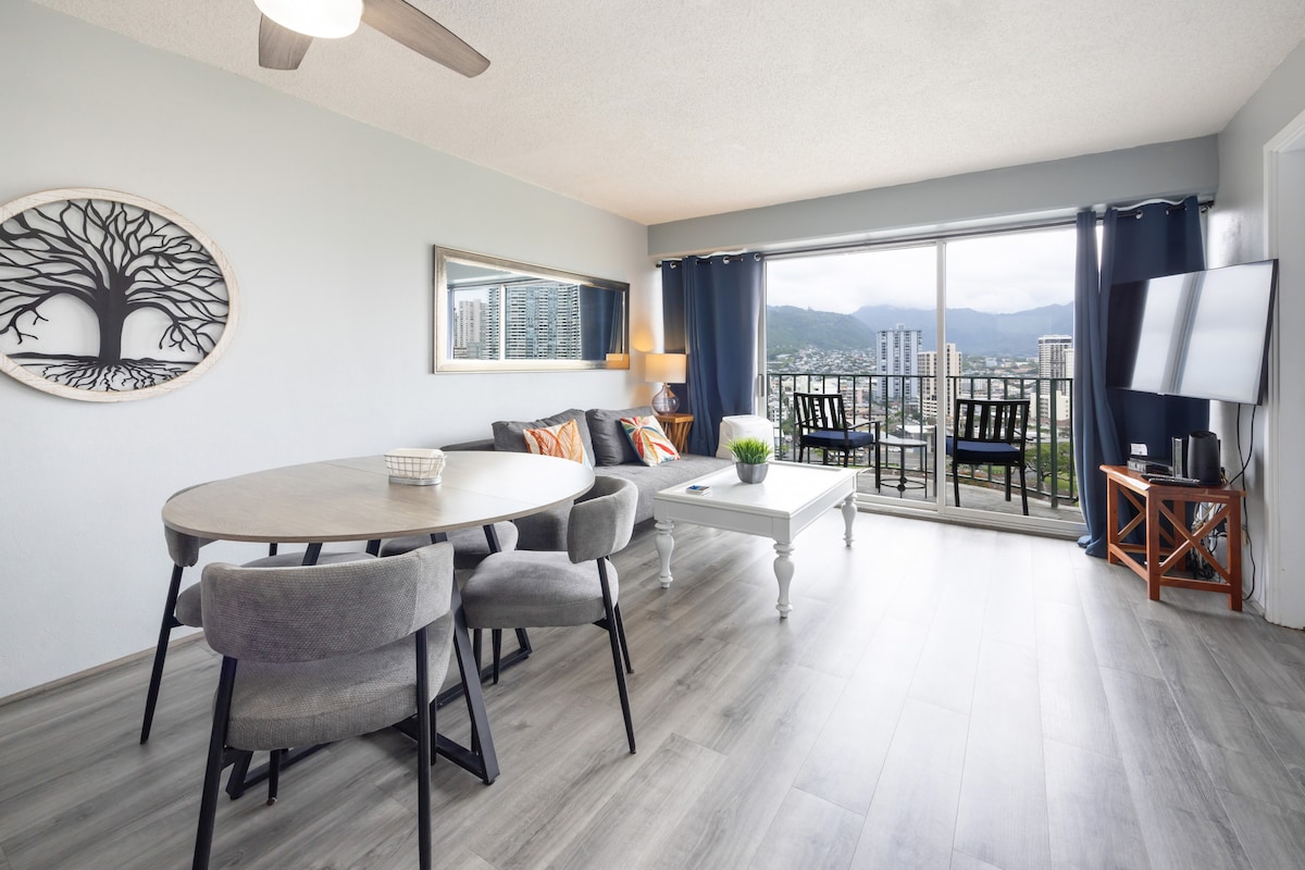 Apartamento renovado de 1 quarto/1 casa de banho no piso superior em Waikiki. Belas vistas panorâmicas desimpedidas de 180 graus para o mar a partir da varanda de Julieta. Veja o fogo de artifício de sexta-feira à noite e o pôr do sol a partir do topo! Cama queen size no quarto. A casa de banho tem um lavatório duplo e uma cabina de duche em vidro. Cozinha totalmente abastecida. Segurança 24 horas por dia, 7 dias por semana, no local. Ar condicionado central, televisão por cabo e Wi-Fi incluídos. Estacionamento em garagem disponível por 35 $ por dia. A cinco minutos a pé da praia de Waikiki, do hotel Hilton, da lagoa Duke e do centro comercial Ala Moana