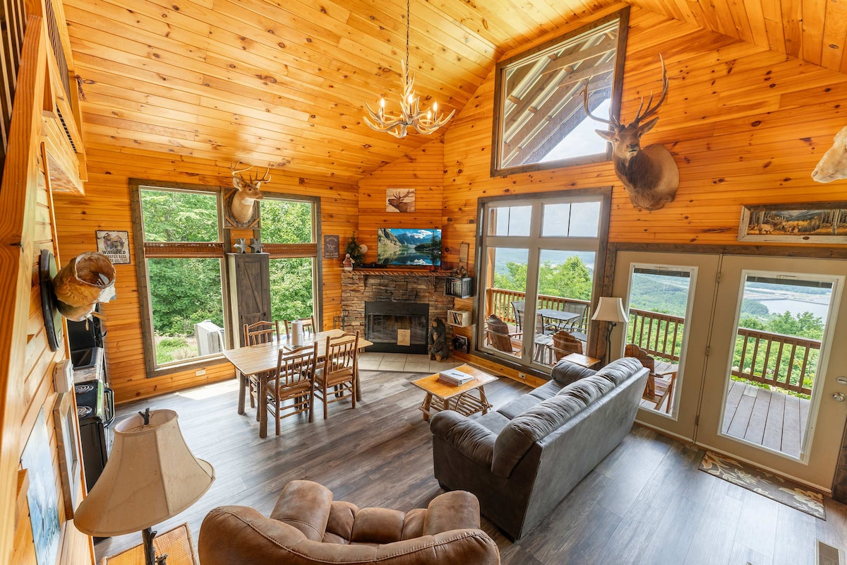 Cabana de madeira recém-reformada com vistas incríveis do nascer do sol de um cume acima da Baía de Waterfront e do canal principal. A meio caminho entre Guntersville e Scottsboro. Apenas 1 1/2 milhas para o lançamento do barco e loja na orla. Lugares próximos - Goosepond, Cathedral Caverns, campo de tiro Cavern Cove, G 'ville St. Park, tirolesa. Deck coberto 8x40, pátio com lareira, grelhas a gás e carvão, buraco de milho, dardos, duas banheiras de hidromassagem, cinco caiaques, uma canoa com equipamento e um trailer. Cães são bem-vindos (mas não há cerca). Relaxe e aproveite!