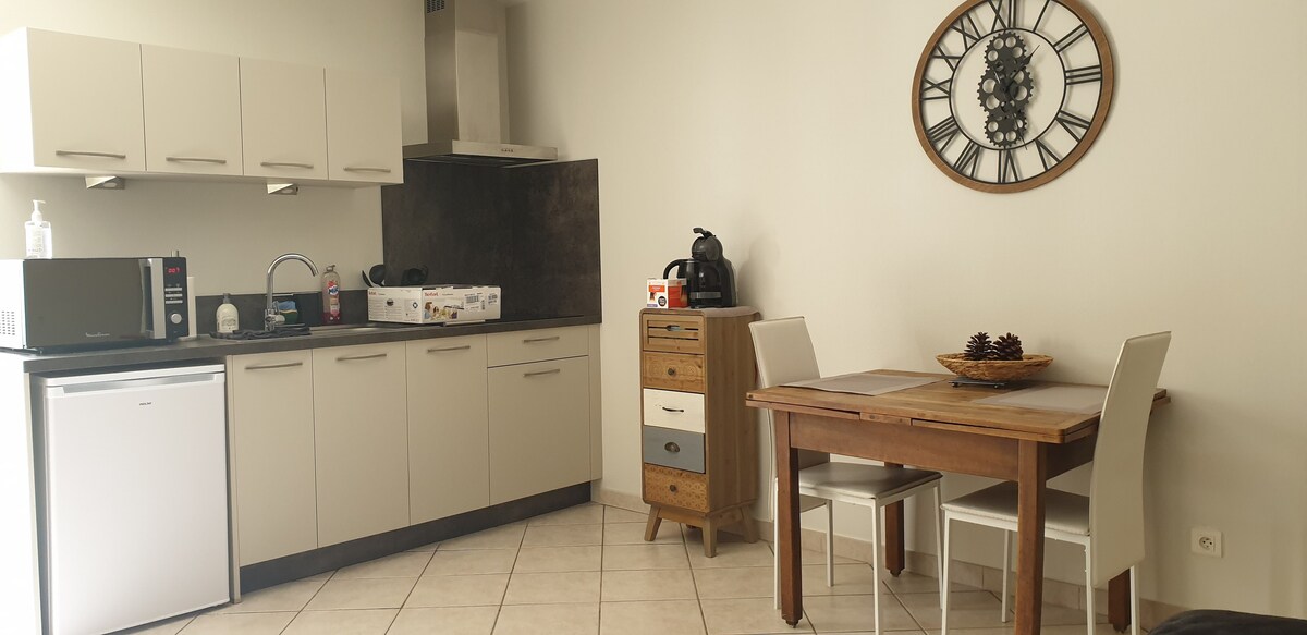 Apartamento de 45 m2 situado no 2.º andar da minha casa, tem um quarto com 1 cama de casal e uma cama de solteiro, uma sala de estar com sofá e um sofá-cama BZ de 140/190, uma cozinha totalmente equipada e uma casa de banho. lençóis, toalhas de banho e limpeza estão incluídos no preço o acesso é pela escadaria principal, a vizinhança é tranquila e agradável a menos de 5 minutos do centro da cidade com lojas Está disponível uma garagem para motos e bicicletas, se necessário.
