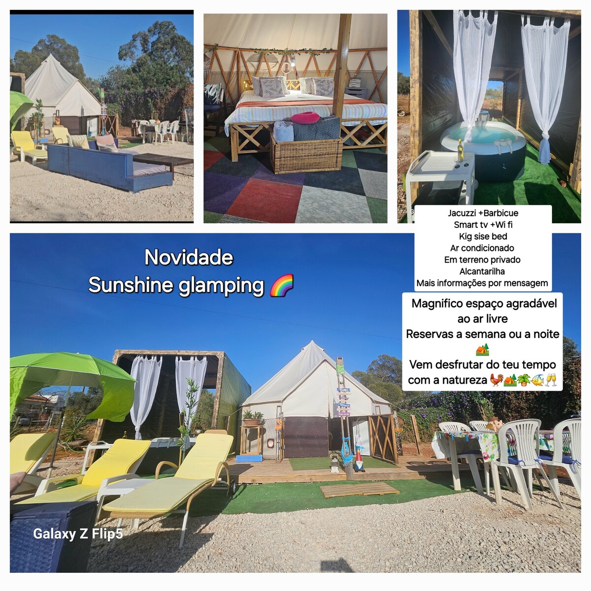Desfrute do cenário encantador deste espaço romântico na natureza. Equipado: Ar condicionado ;Barbicue ;jacuzzi mesas exteriores; Sofa exterior; Baloiço; coluna bluetooth ;Cama extra insuflável ;Smart tv ;Wi-fi; Duche ; piscina criança ;Bacia; Sanita;Placa eléctrica ;Frigorífico ;Torradeira;Microondas ;Chaleira ;Maquina de cafe,tapete para exercícios; cartas... O estacionamento é privado, partilhado, todo o restante é só para o hospede. This luxurious tent has everything you need from 3 days
