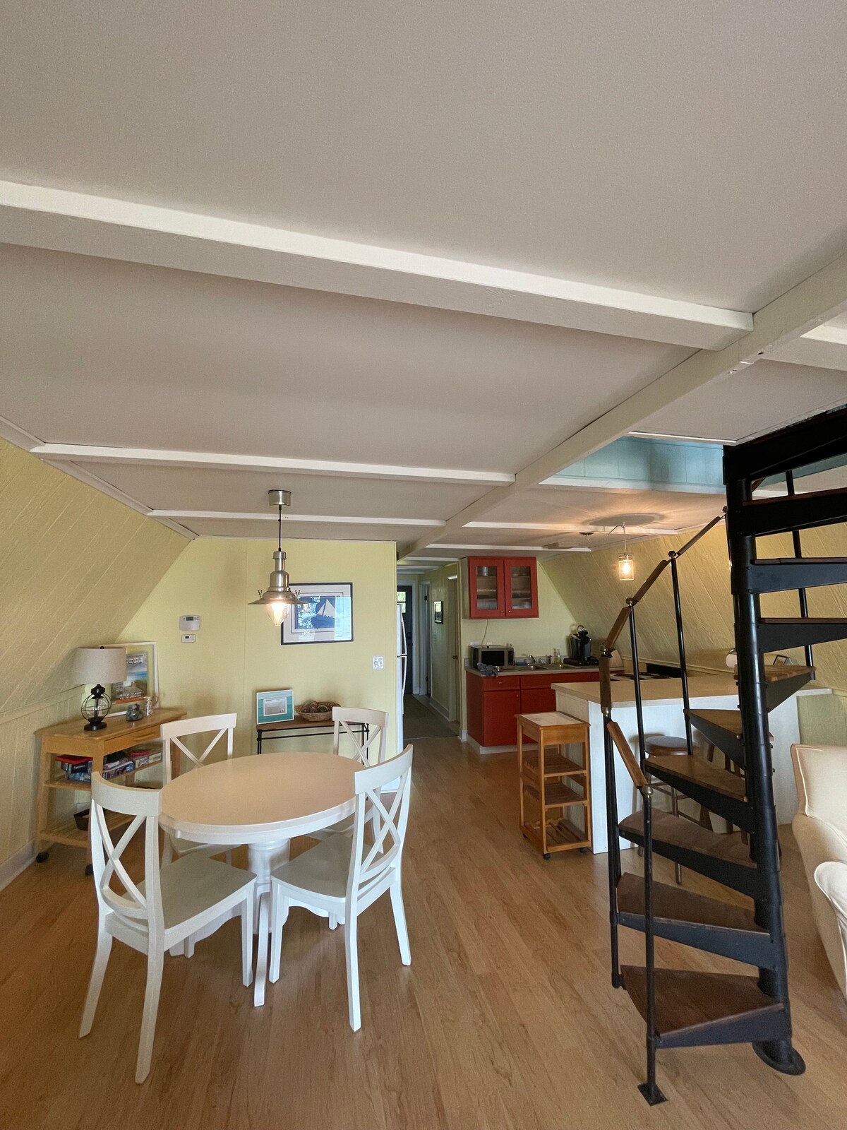 A fixer-upper. The house is ready now with some ongoing projects. The house is one bedroom on top of a two-car garage so being able to climb steps is a must to enter the living space. The house is located in town. Less than a 5-minute stroll to the lake passing a coffee and ice cream shop, a consignment shop, an art gallery, etc. This is a great place to stay for the Harbor Town Weekend in September. Great for the business traveler for Alcona County. Hope to see you soon.