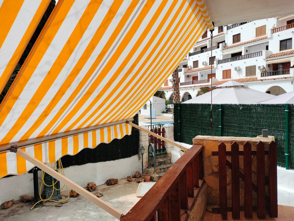 Apartamento com terraço privado e relvado comum para crianças e não para as crianças desfrutarem do ar livre. Um ar condicionado com bomba de frio e calor na sala de jantar. 2 quartos com janelas. Piscina infantil e para adultos no complexo. A praia de Las Fuentes é arenosa e fica a 5"a pé (com os mais pequenos um pouco mais☺️). Sierra de Irta nas proximidades, com trilhos de ciclismo de montanha, caminhadas e enseadas espetaculares para nadar. E nos meses de inverno é tranquilo e bom tempo.