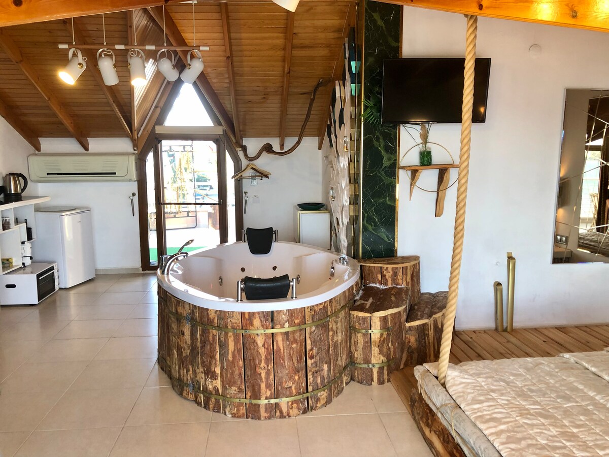 Kumsalda yer alan ve XL Jakuzi, firepit, sinema, şömine , salıncak , barbekü ve çok sayıda lux olanaklarla donatılmış bu eşsiz daire sizi bekliyor. Dairede 2 büyük teras, banyo ve mini mutfak bulunmaktadır. Daire 3. katta bulunmakta ve kullanımı yalnızca size ait asansörle giriş sağlanmaktadır.Binadan bağımsız giriş ve özel kullanım alanlarına sahiptir.