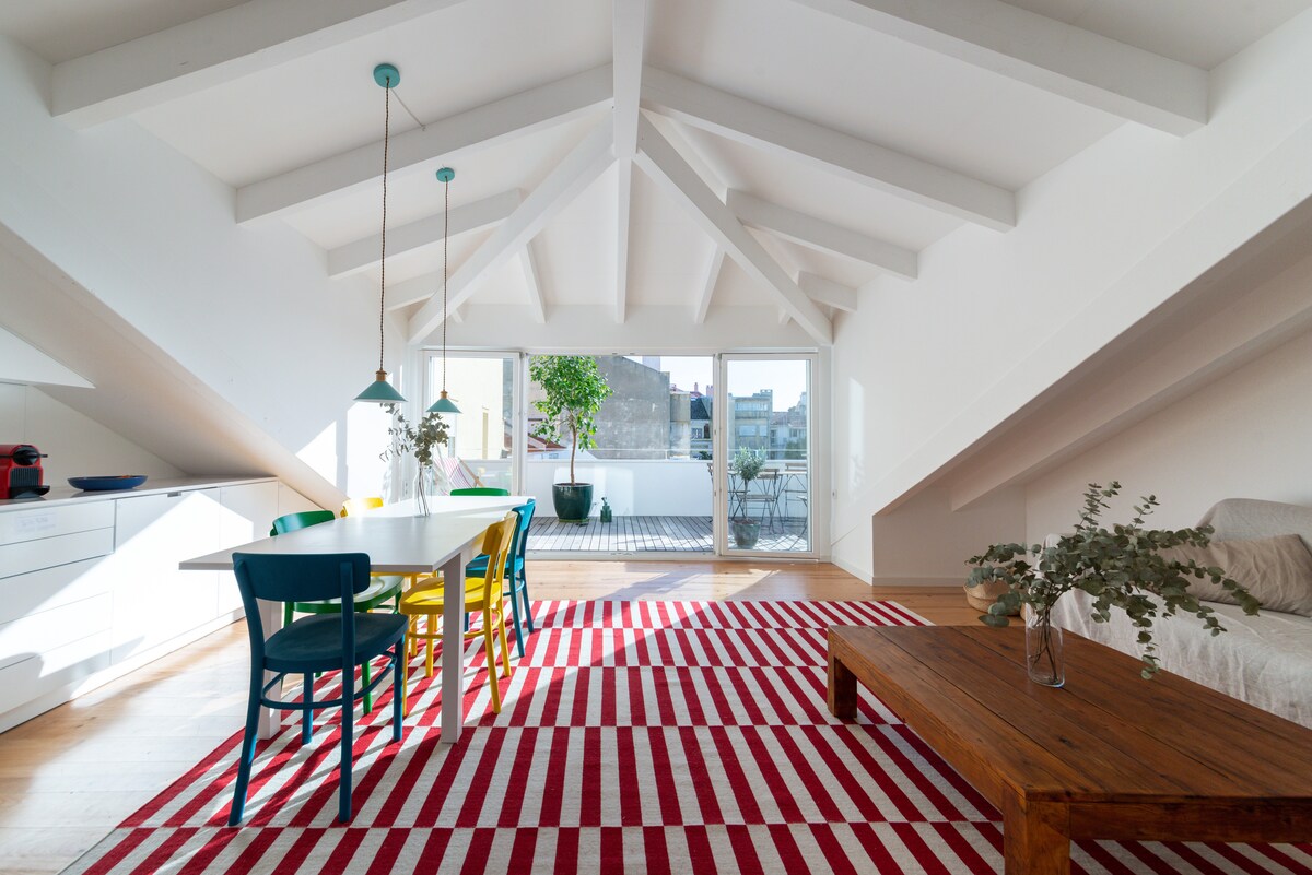 Embrance yourself in the most beautiful and cool Penthouse of the city, with a great terrace and perfectly located in the center of Lisbon, by the river. An unique 3 bedroom apt full of light, carefully renovated, with a modern design keeping beautiful historical details (with AC & lift). In Lisbon's most charismatics neighbourhoods, Bica and trendy Cais do Sodré, where you'll find all kind of restaurants, bars, shops...Perfect place for your holidays which allows you to explore Lisbon by foot!