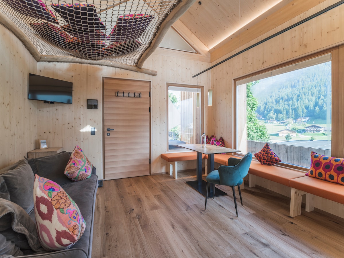 Na categoria Suíte Premium Deluxe com sauna, você encontrará um apartamento de 103 m² para até oito pessoas com três quartos separados e uma espaçosa sala de estar e jantar. O apartamento também dispõe de uma cozinha completa, dois luxuosos banheiros com chuveiros de grandes dimensões, uma moderna cabine de infravermelho e um terraço de 40 m². Como destaque absoluto, o apartamento dispõe de uma sauna panorâmica privativa com uma vista única para as montanhas tirolesas.