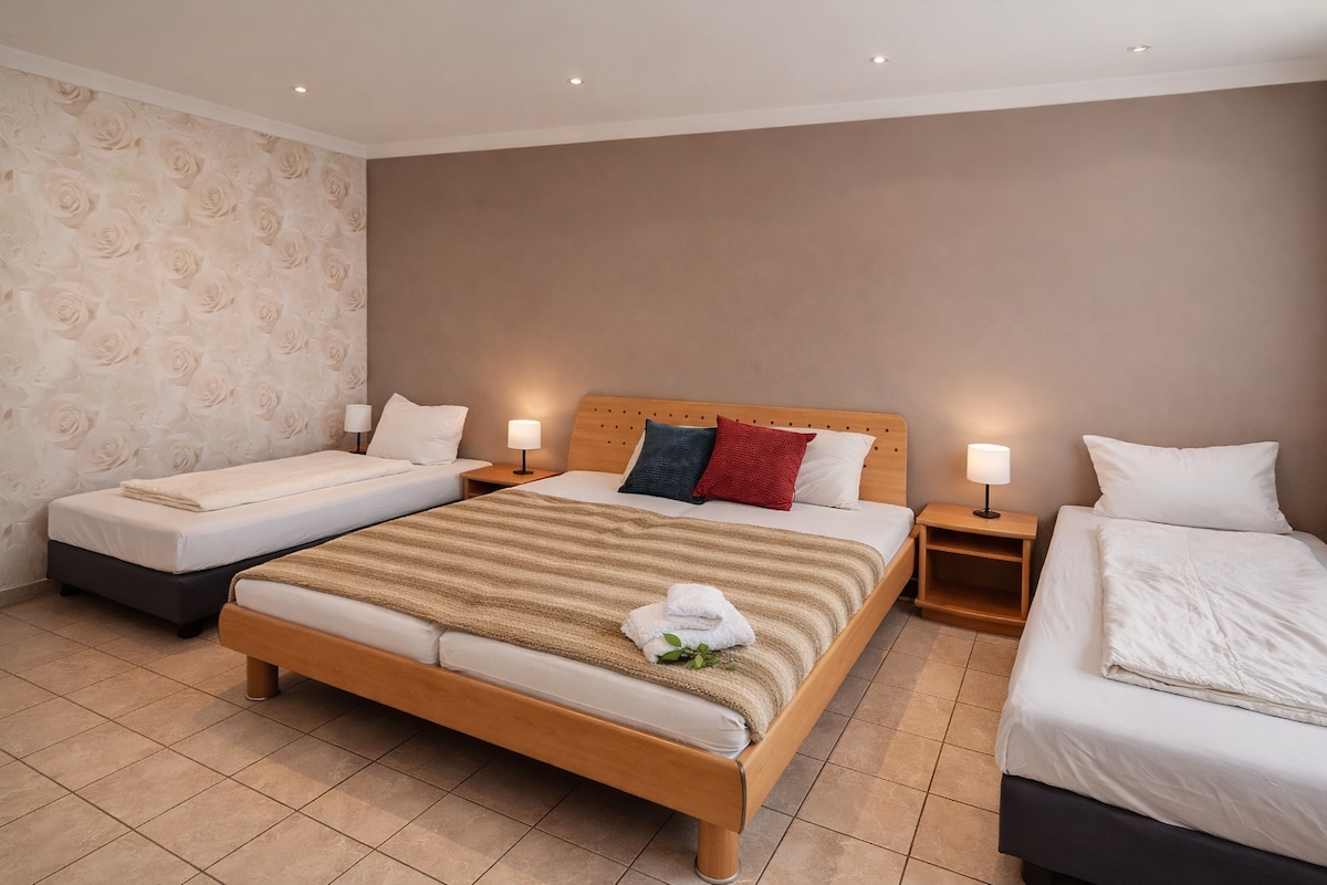 Este espaço acolhedor é bom para viagens em grupo. Há 1 cama de casal (1,40 m) + três camas individuais + um sofá-cama para duas pessoas na sala de estar. Berço + cadeira alta disponíveis. A cozinha totalmente equipada oferece a oportunidade de cuidar de si mesmo. De autocarro e comboio, a ligação a Frankfurt, Hanau, Gießen ou Friedberg fica a 90 - 120 minutos, de carro a cerca de 20-40 minutos. A autoestrada A45 fica a cerca de 5 minutos.