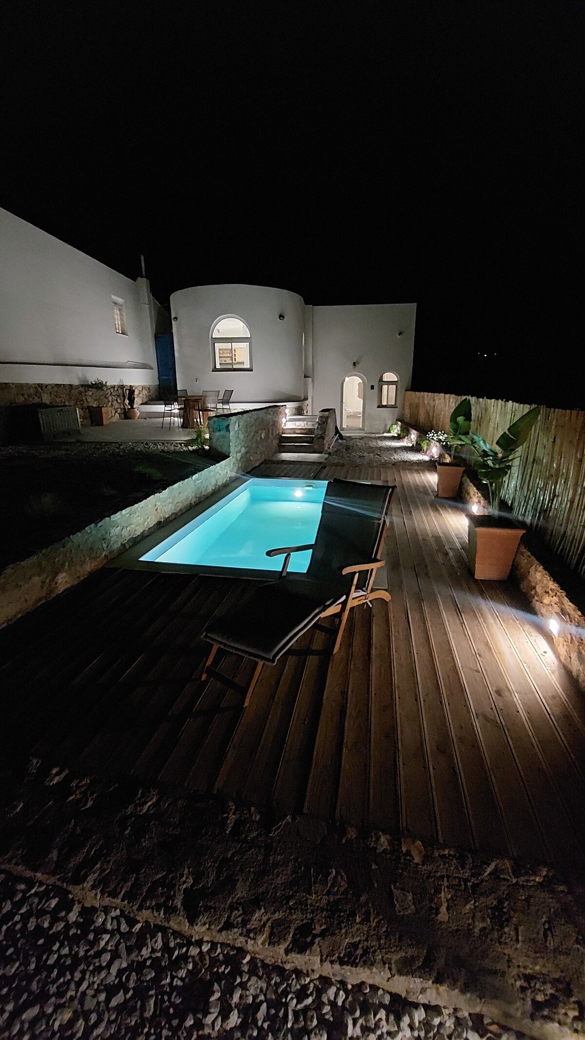 Bem-vindo à sua moradia de sonho, construída em contacto com uma formação rochosa! Esta residência oferece dois quartos com casas de banho privativas. (1 com sofá-cama extra) A moradia está situada num terreno de 6000 m2 repleto de pinheiros e olivais. Vários degraus levam à sua praia isolada. A cozinha e a sala de jantar no átrio têm vistas panorâmicas para o mar. Os espaços exteriores de 120 m2 incluem uma área de estar protegida por uma pérgola sombreada, espreguiçadeiras, um local de refeições ao ar livre, churrasqueira, chuveiro