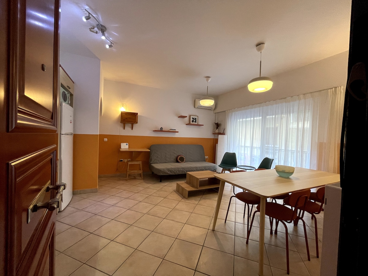 Apartamento tranquilo, a 100 metros da Embaixada dos EUA. 46 metros quadrados, reformado, entrada independente, rua de pedestres. 350 metros para Megaron Music Hall Metro. Praça Mavili com restaurantes, lojas, ônibus para o aeroporto. 1 km até a Colina Lycabettus, 500 m até a Praça Kolonaki. Perto de hospitais. Iluminado, janela, pátio, plantas. Quarto, cama de casal, TV, ar condicionado, máquina de lavar roupa, armários. Banheiro, chuveiro. Sala de estar, sofá-cama. Cozinha para refeições. Tranquilo, seguro, 24h. Ambiente limpo e confortável.