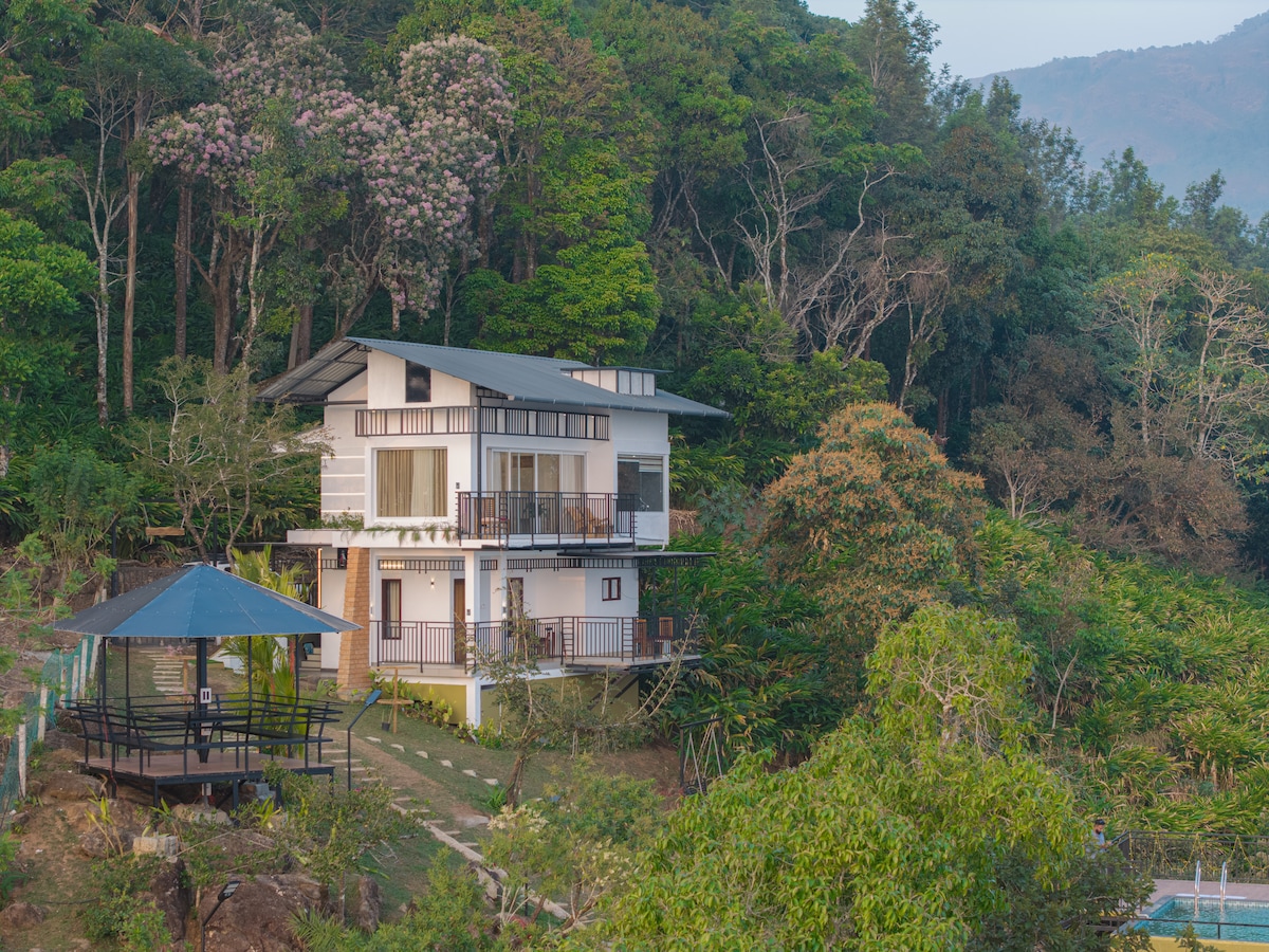 Uma casa de campo em pedra restaurada a 1000 metros de altitude em Vagamon, Kerala. Refúgio ecológico autossuficiente em cinco acres de floresta — alimentado a energia solar e eólica, refeições da quinta para a mesa preparadas pelo chef Anoop, sem televisão e com verdadeira tranquilidade. A casa de campo foi outrora um barracão de trabalho numa propriedade agrícola. Paredes de pedra originais, interiores confortáveis, uma varanda com vista para o vale. Não é um resort. Não há piscina nem spa. O que existe: o canto dos cálaos ao amanhecer, fogueiras sob a Via Láctea e a sensação de estar completamente fora do mapa.