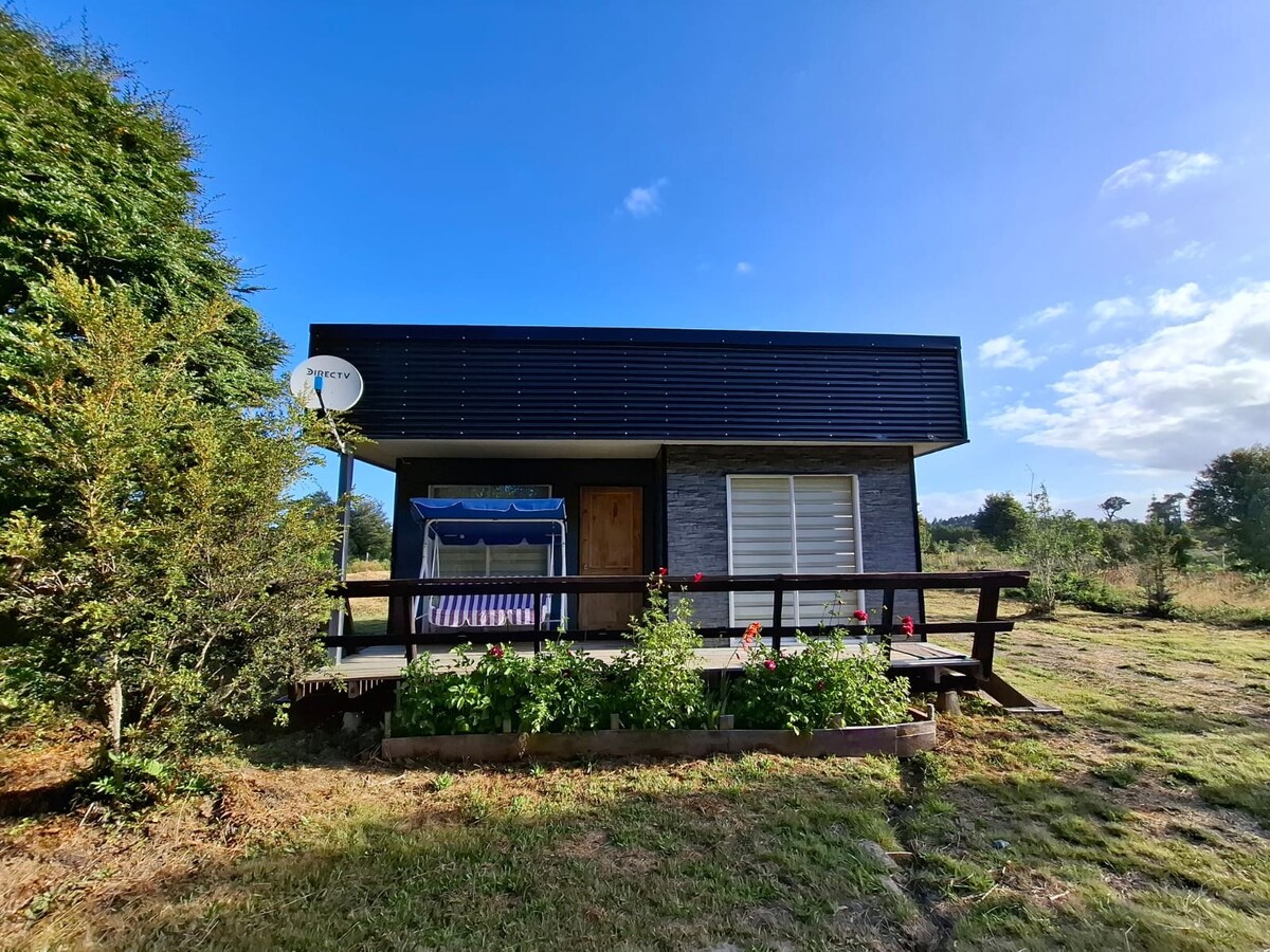 Cabina para 5 pessoas. Sala de estar, sala de jantar e cozinha, dois quartos e duas casas de banho (uma cama de casal, uma cama de solteiro e um sofá futon numa sala comum), ar condicionado, TV com Directv, grelhador, água quente com bomba de calor. Terraço e pátio grande. Zona rural e tranquila, pode relaxar com o canto dos pássaros. Estamos perto da praia de Huicha, onde pode caminhar. Estamos a cerca de 10 minutos do centro de Ancud. Jogo infantil ao ar livre.