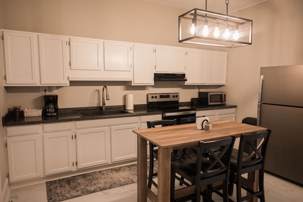 The Homestead: this newly renovated home is stylish and centrally located. Situated in the heart of Downtown Lawrenceburg, just minutes from local shops, the county park, and a short drive to several Bourbon Distilleries! This home is great for groups and families looking to get away- with 3 beds and a pull out couch to accommodate your party's size. Upon entry you'll find a fully stocked kitchen with a large island for meal prep, a charming living room with Smart TV tech, and a fire pit. Cheers