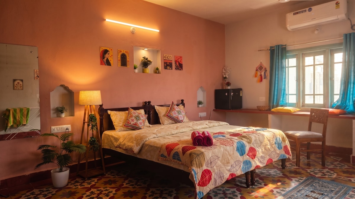 AURA'S NEST | Vila privada 2BHK | Público jovem | Casais e estudantes CARACTERÍSTICA DO QUARTO Quarto: AC, cama feita e espelho Sala de estar: TV com streaming e espaço acolhedor Banho:Mergulhe na banheira grande Exterior: fogueira ou churrasco Cozinha: fogão a gás, utensílios e frigorífico Jantar: estilo pub SOB DEMANDA Ajuda Oncall Food Swiggy/Zomato Cab Ola/Uber Aplicação Spa UC COMODIDADES Frigorífico para refrigerar cerveja Refrigerador de ar 35 L Inversor de potência Assentos ao ar livre NAS PROXIMIDADES Concerto: Escola de Equitação da Embaixada, Terraform Pubs e cafés Lagos para vista panorâmica Vinha para enoturismo