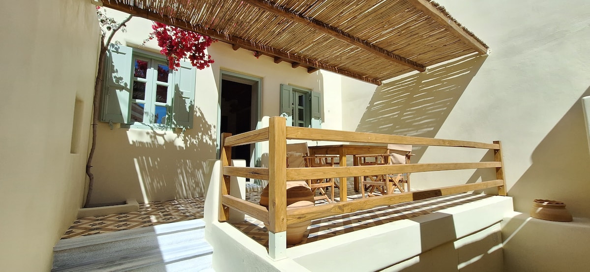 Casa tradicional de pedra única, dentro do povoado medieval de Ano Syros. A residência foi licenciada pela Organização Nacional de Turismo da Grécia como alojamento turístico. Remonta ao final do século XVI. Totalmente renovado sem alterar o seu carácter tradicional. No andar de cima, encontra-se a sala de estar (com um sofá-cama duplo), bem como a cozinha (exterior). O andar de baixo é o quarto, com uma cama de casal e a casa de banho. Ideal para duas pessoas, embora possa acomodar até quatro.