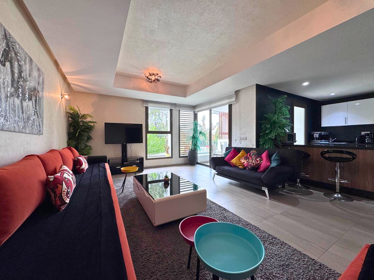 🌴 La Petite Palmeraie - Residência de bem-estar, Tamraght Bem-vindo à nossa residência de bem-estar, onde o relaxamento e o conforto estão no centro da experiência. Os residentes têm acesso privilegiado ao spa e hammam Mianïa, reservado para mulheres, mediante reserva, com um desconto de 10%. Apartamento com: * 2 quartos e 2 casas de banho * Sala de estar e varanda/terraço privado * Cozinha equipada e TV * Piscina partilhada