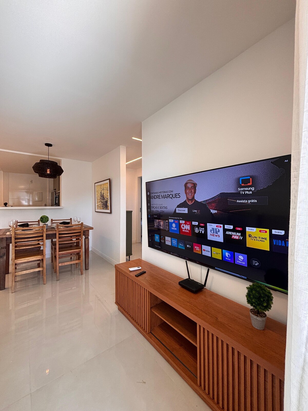 Apartamento de 2 quartos com ar-condicionado, sala integrada à cozinha equipada e churrasqueira privativa. Conforto e lazer com uma linda vista para o mar. Ideal para famílias, casais ou amigos que buscam praticidade e momentos especiais perto da praia, com mercados e restaurantes por perto. Wi-Fi disponível para sua comodidade. Nosso condomínio tem piscina adulto e infantil, salão de jogos, brinquedoteca e saunas seca e a vapor. Temos uma vaga de garagem também.