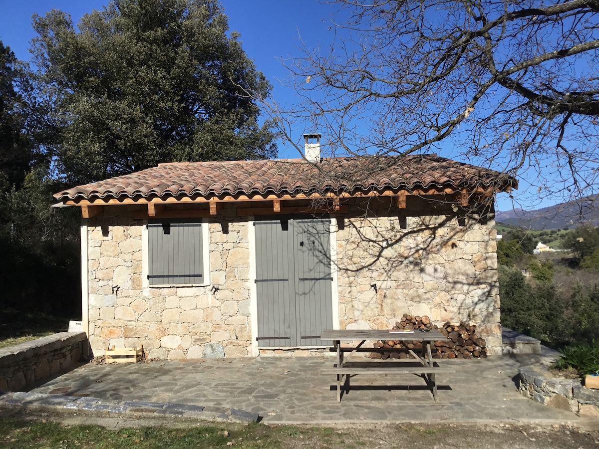 Situated in the heart of the maquis, this former sheepfold offers 80 m² of living space and is surrounded by several hectares of land with oak and olive trees. The house comprises a bedroom with a double bed, a bathroom with an Italian shower, a separate toilet, a fully-equipped kitchen and a spacious living room. The large shaded terrace has a large table, barbecue and deckchairs, ideal for admiring the view of the mountains and the starry sky.