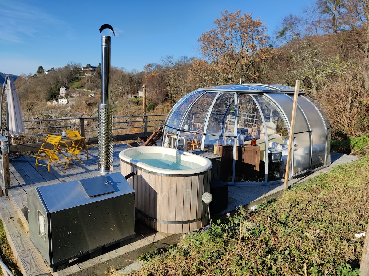 No meio do campo de Lotois, a poucos minutos do abismo de Padirac e da cidade de Rocamadour . Oferecemos a nossa cúpula que lhe permite estar o mais próximo possível da natureza com todos os confortos de uma suite. Ideal para uma noite romântica, o nosso banho de lenha em madeira nórdica irá permitir-lhe desfrutar da calma da natureza circundante