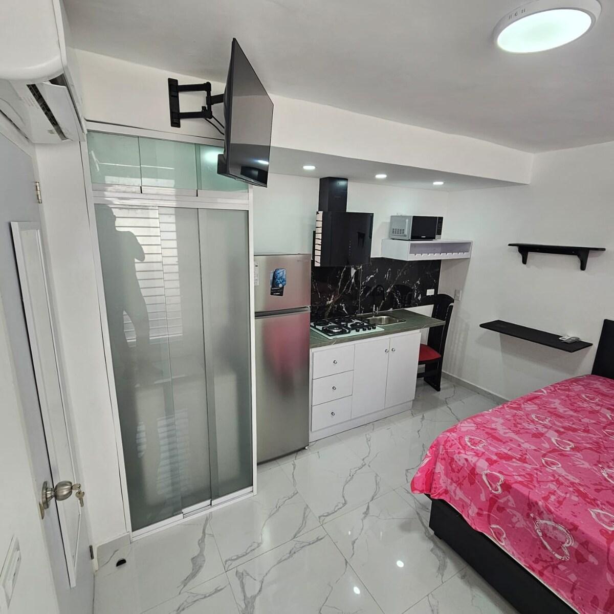 Este acogedor ANEXO tipo estudio ofrece todo lo necesario y es compacto y moderno. Ubicado en una zona céntrica, cuenta con una cama matrimonial, una cocina totalmente equipada con estufa, refrigerador y microondas. Este diseño claro crea un ambiente elegante y luminoso. Hay estanterías y espacio de almacenamiento, lo que permite mantener todo ordenado. Es perfecto para una o dos personas que busca comodidad, funcionalidad y cercanía a los principales puntos de interés de la ciudad.