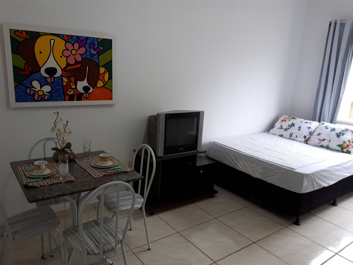 O Studio possui cozinha e quarto integrado, sacada e banheiro. Andar alto com elevador. Uma vaga de garagem. Próximo a rodoviária. Possui uma cama de casal Queen (colchão magnético), com opção de + 1 colchão de solteiro no chão (com cobrança de taxa extra p/ o 3°hospede). *Para que a reserva seja efetivada é necessário informar o nome de todos os hóspedes. O congelador pode não estar disponível, pois utilizamos o apto quando não há reservas. NÃO ACEITAMOS RESERVAS DESTINADAS A ENCONTROS!