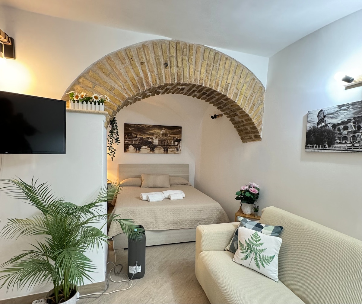 O apartamento, totalmente reformado, está localizado em uma rua tranquila do bairro de Monti, no segundo andar de uma escada com degraus de pedra cinza, típica das torres medievais. É composto por um quarto espaçoso e luminoso com teto de caixotões de madeira e cama de casal, uma pequena sala de estar com kitchenette totalmente equipada e um banheiro de mármore com pia dupla. O mobiliário é de alta qualidade e complementado por cartazes refinados dos anos 1920.