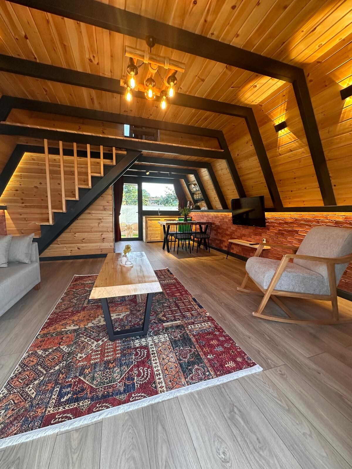 - A nossa casa de bungalow foi concebida completamente de madeira e autêntica. - A nossa casa de bungalow tem uma lareira e tem uma magnífica vista para o vale e para a montanha. - O nosso quarto tem uma largura de 45 m2. - É um conceito que os casais em lua de mel podem escolher facilmente. - O piso inferior tem a forma de uma área de estar; há uma cama de casal no piso superior, como uma varanda, sofá, casa de banho, TV, mini-bar, etc.
