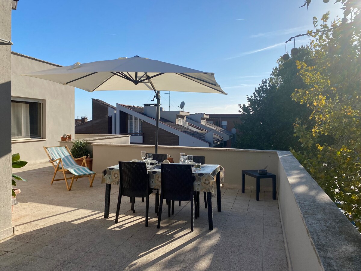 Just 25 minutes by train from Rome and 3 km from Ciampino airport, welcoming attic apartment consisting of 1 bedroom with double bed, 1 bedroom/living room with double sofa bed, 1 additional sofa bed, kitchen, bathroom with tub, laundry room and 80 m2 terrace . Free parking on the property. Nestled between Rome and the Castelli Romani. 8 minutes walk from the station. Bus to the metro and Castelli Romani nearby. Self check-in available if Claudia cannot welcome you in person.