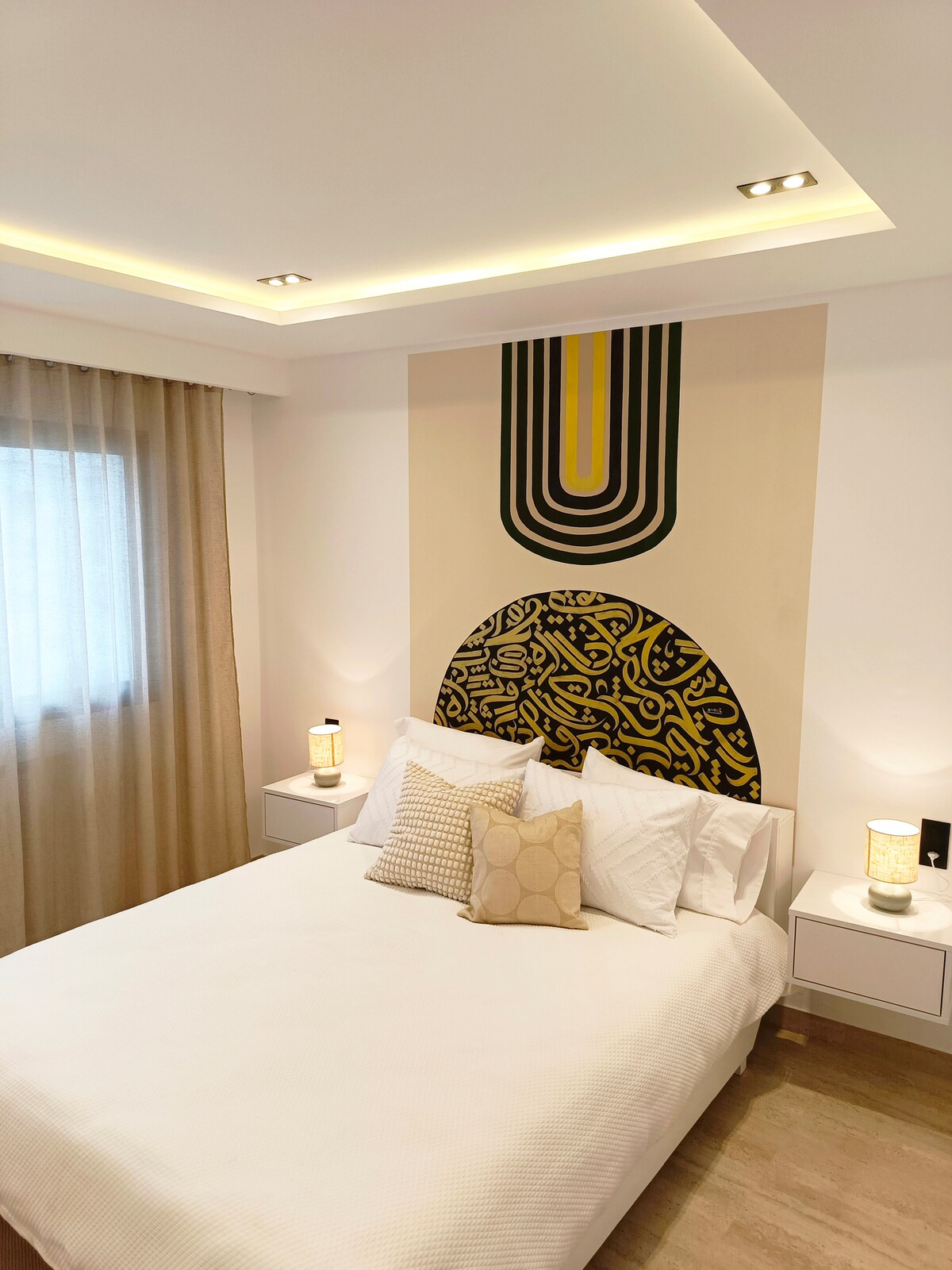 *UM quarto 🛌 com cama king size, espaço de trabalho portátil amigável e um curativo * UMA casa de banho 🛁 com bandeja de banho, velas, sabonete líquido, papel higiénico e toalhas frescas * Cozinha totalmente equipada com itens essenciais para o pequeno-almoço🍳, 🇹🇳 especiarias tunisinas caseiras para fazer comida deliciosa 🥘 * A cozinha está a abrir numa sala de estar espaçosa com sofá em forma de L, onde poderá desfrutar de ver os seus filmes favoritos 🎥 * Uma grande varanda onde pode desfrutar de um chá 🍵 da tarde com vista (a máquina de lavar 🧺 está nos cantos)
