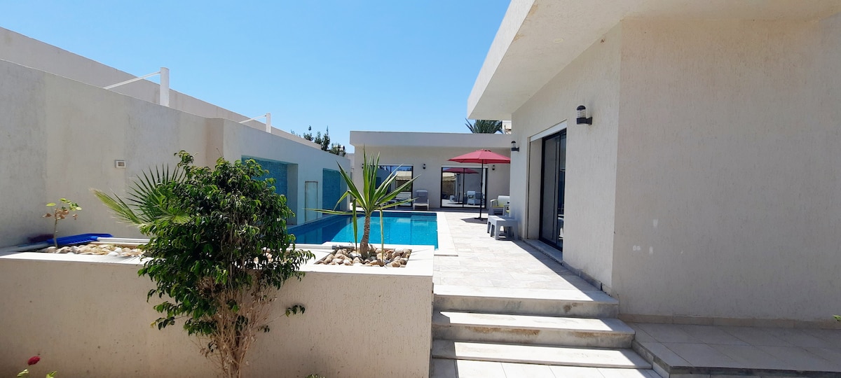 ⛱️Descubra o luxo absoluto em Djerba ao ficar na nossa prestigiada moradia, idealmente localizada a uma curta caminhada da praia Ideal para férias com a família ou amigos, a moradia tem 3 suites espaçosas, uma sala de estar confortável, uma cozinha equipada com vista para uma piscina privada sem vis-à-vis e muito segura, bem como um terraço com vista para o mar. Podemos organizar a entrega de refeições, pequenos-almoços Jacuzzi aquecida por um custo adicional