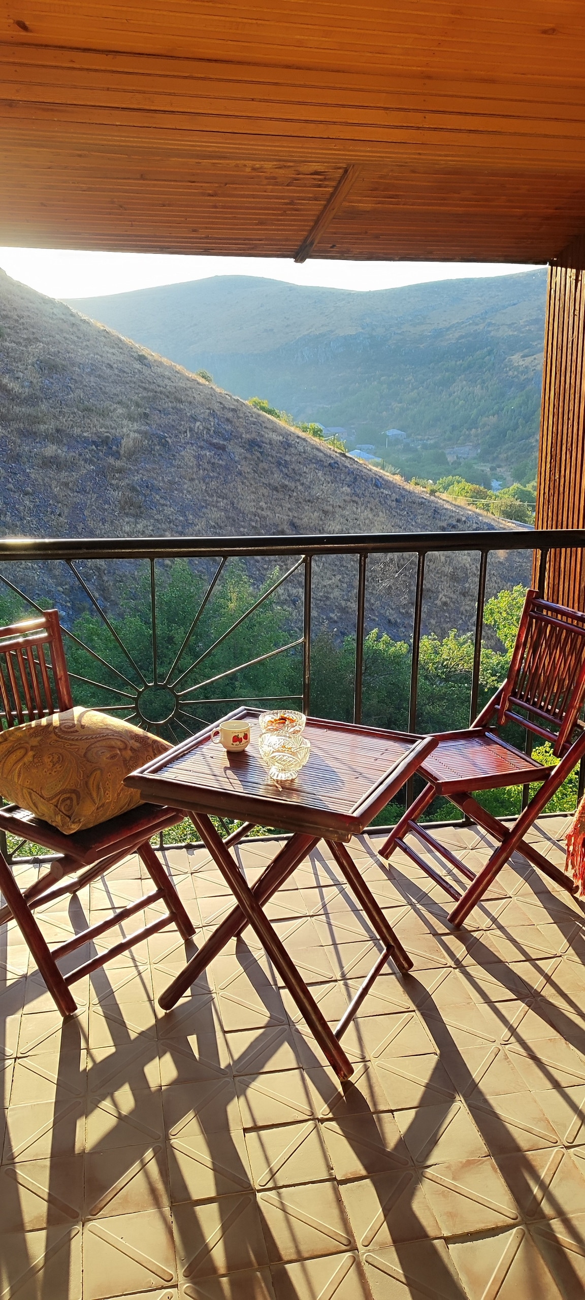 We offer the entire top floor of our summer house – a cozy attic (36 sq.m) with a spacious balcony (11 sq.m) overlooking the cliffs. Perfect for families, friends, or small groups. The space is open-plan, with no separate rooms. The wooden ceiling, sloped roof corners, and windows create a warm and friendly atmosphere. Enjoy your time in balcony with table, chairs, and a comfortable sofa, drink a herbal tea from traditional samovar